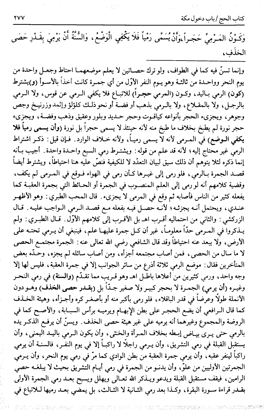 وَهُوَ قَرِيبٌ مِمَّا تَقَدَّمَ (وَالسُّنَّةُ) فِي رَمْيِ النَّحْرِ وَغَيْرِهِ (أَنْ يَرْمِيَ) الْجَمْرَةَ لَا بِحَجَرٍ كَبِيرٍ وَلَا صَغِيرٍ جِدًّا بَلْ (بِقَدْرِ حَصَى الْخَذْفِ) وَهُوَ دُونَ الْأُنْمُلَةِ طُولًا وَعَرْضًا فِي قَدْرِ الْبَاقِلَّاءِ، فَلَوْ رَمَى بِأَكْبَرَ مِنْهُ أَوْ بِأَصْغَرَ كُرِهَ وَأَجْزَأَهُ، وَهَيْئَةُ الْخَذْفِ كَمَا قَالَ الرَّافِعِيُّ أَنْ يَضَعَ الْحَجَرَ عَلَى بَطْنِ الْإِبْهَامِ وَيَرْمِيَهُ بِرَأْسِ السَّبَّابَةِ، وَالْأَصَحُّ كَمَا فِي الرَّوْضَةِ وَالْمَجْمُوعِ وَغَيْرِهِمَا أَنَّهُ يَرْمِيهِ عَلَى غَيْرِ هَيْئَةِ حَصَى الْخَذْفِ. وَيُسَنُّ أَنْ يَرْفَعَ الذَّكَرُ يَدَهُ بِالرَّمْيِ حَتَّى يُرَى بَيَاضُ إبِطِهِ بِخِلَافِ الْمَرْأَةِ وَالْخُنْثَى، وَأَنْ يَكُونَ الرَّمْيُ بِالْيَدِ الْيُمْنَى، وَأَنْ يَسْتَقْبِلَ الْقِبْلَةَ فِي رَمْيِ التَّشْرِيقِ، وَأَنْ يَرْمِيَ رَاجِلًا لَا رَاكِبًا إلَّا فِي يَوْمِ النَّفْرِ، فَالسُّنَّةُ أَنْ يَرْمِيَ رَاكِبًا لِيَنْفِرَ عَقِبَهُ، وَأَنْ يَرْمِيَ جَمْرَةَ الْعَقَبَةِ مِنْ بَطْنِ الْوَادِي كَمَا مَرَّ فِي رَمْيِ يَوْمِ النَّحْرِ، وَأَنْ يَرْمِيَ الْجَمْرَتَيْنِ الْأُولَيَيْنِ مِنْ عُلْوٍ، وَأَنْ يَدْنُوَ مِنْ الْجَمْرَةِ فِي رَمْيِ أَيَّامِ التَّشْرِيقِ بِحَيْثُ لَا يَبْلُغُهُ حَصَى الرَّامِينَ، فَيَقِفُ مُسْتَقْبِلَ الْقِبْلَةِ وَيَدْعُو وَيَذْكُرُ اللَّهَ تَعَالَى وَيُهَلِّلُ وَيُسَبِّحُ بَعْدَ رَمْيِ الْجَمْرَةِ الْأُولَى بِقَدْرِ قِرَاءَةِ سُورَةِ الْبَقَرَةَ، وَكَذَا بَعْدَ رَمْيِ الثَّانِيَةِ لَا الثَّالِثَةِ، بَلْ يَمْضِي بَعْدَ رَمْيِهَا لِلِاتِّبَاعِ فِي