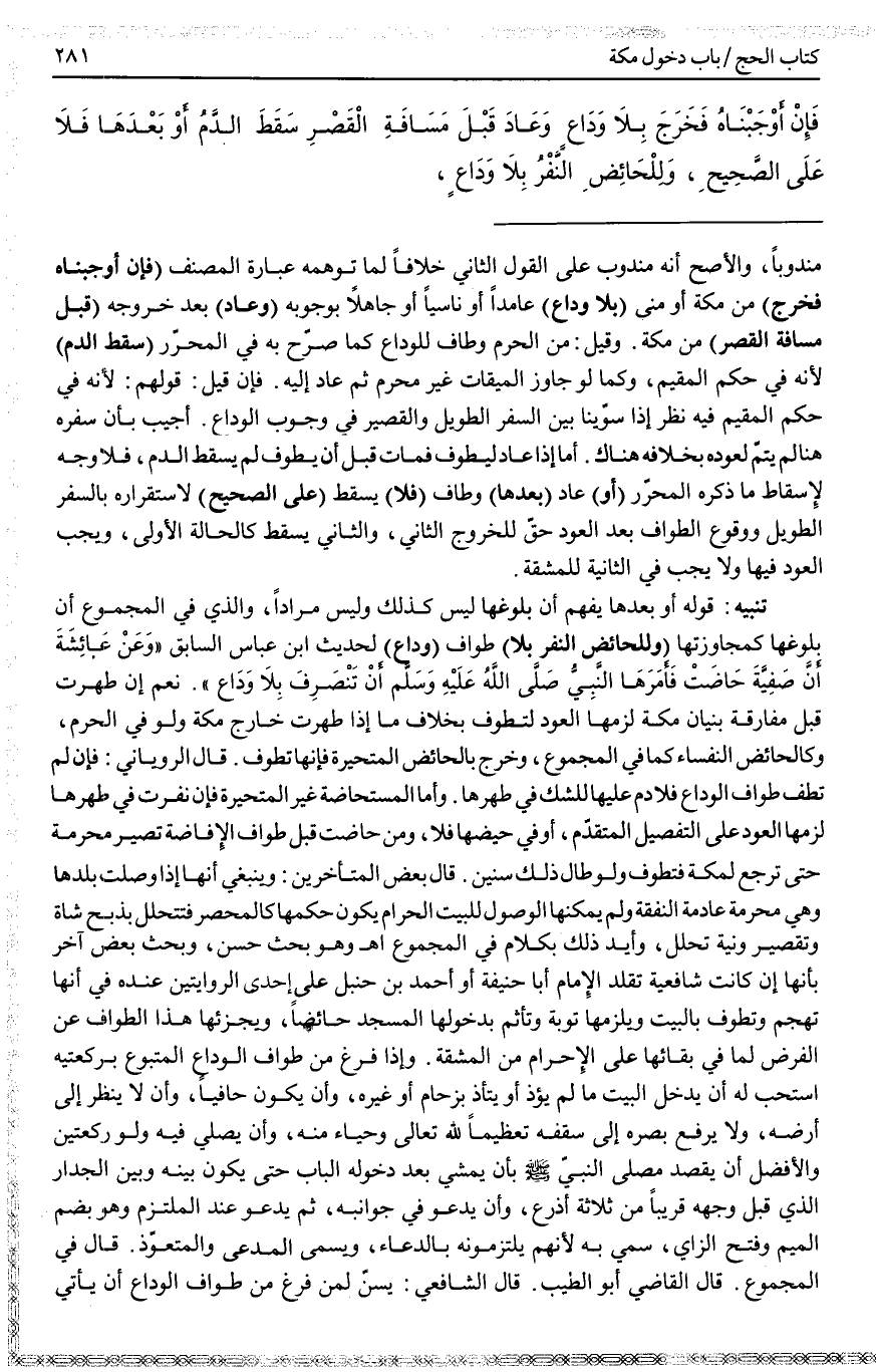 ـــــــــــــــــــــــــــــQمَنْدُوبًا، وَالْأَصَحُّ أَنَّهُ مَنْدُوبٌ عَلَى الْقَوْلِ الثَّانِي خِلَافًا لِمَا تُوهِمُهُ عِبَارَةُ الْمُصَنِّفِ (فَإِنْ أَوْجَبْنَاهُ فَخَرَجَ) مِنْ مَكَّةَ أَوْ مِنًى (بِلَا وَدَاعٍ) عَامِدًا أَوْ نَاسِيًا أَوْ جَاهِلًا بِوُجُوبِهِ (وَعَادَ) بَعْدَ خُرُوجِهِ (قَبْلَ مَسَافَةِ الْقَصْرِ) مِنْ مَكَّةَ. وَقِيلَ: مِنْ الْحَرَمِ وَطَافَ لِلْوَدَاعِ كَمَا صَرَّحَ بِهِ فِي الْمُحَرَّرِ (سَقَطَ الدَّمُ) لِأَنَّهُ فِي حُكْمِ الْمُقِيمِ، وَكَمَا لَوْ جَاوَزَ الْمِيقَاتَ غَيْرَ مُحْرِمٍ ثُمَّ عَادَ إلَيْهِ.