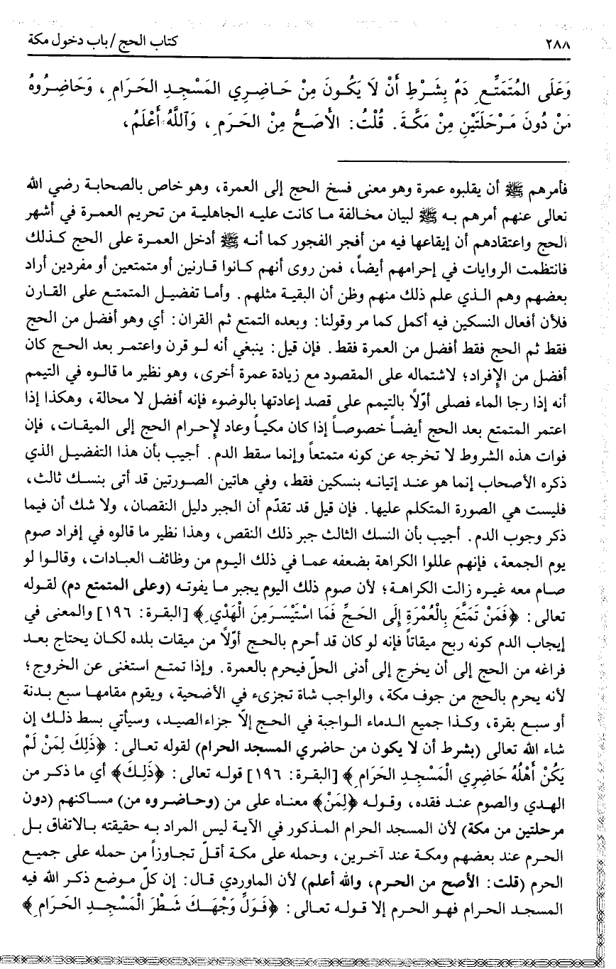 وَعَلَى الْمُتَمَتِّعِ دَمٌ بِشَرْطِ أَنْ لَا يَكُونَ مِنْ حَاضِرِي الْمَسْجِدِ الْحَرَامِ، وَحَاضِرُوهُ مَنْ دُونَ مَرْحَلَتَيْنِ مِنْ مَكَّةَ. قُلْت: الْأَصَحُّ مِنْ الْحَرَمِ، وَاَللَّهُ أَعْلَمُ،