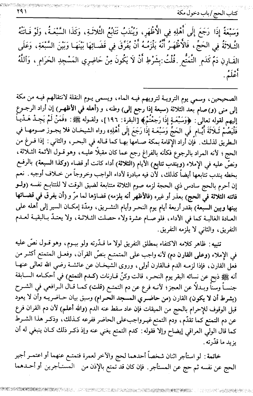 (وَعَلَى الْقَارِنِ دَمٌ) لِأَنَّهُ وَاجِبٌ عَلَى الْمُتَمَتِّعِ بِنَصِّ الْقُرْآنِ، وَفِعْلُ الْمُتَمَتِّعِ أَكْثَرُ مِنْ فِعْلِ الْقَارِنِ، فَإِذَا لَزِمَهُ الدَّمُ فَالْقَارِنُ أَوْلَى، وَرَوَى الشَّيْخَانِ عَنْ عَائِشَةَ - رَضِيَ اللَّهُ تَعَالَى عَنْهَا - «أَنَّهُ - صَلَّى اللَّهُ عَلَيْهِ وَسَلَّمَ - ذَبَحَ عَنْ نِسَائِهِ الْبَقَرَ يَوْمَ النَّحْرِ» ، قَالَتْ وَكُنَّ قَارِنَاتٍ (كَدَمِ التَّمَتُّعِ) فِي أَحْكَامِهِ السَّابِقَةِ جِنْسًا وَسِنًّا وَبَدَلًا عَنْ الْعَجْزِ؛ لِأَنَّهُ فَرْعٌ عَنْ دَمِ التَّمَتُّعِ (قُلْت) كَمَا قَالَ الرَّافِعِيُّ فِي الشَّرْحِ (بِشَرْطِ أَنْ لَا يَكُونَ) الْقَارِنُ (مِنْ حَاضِرِي الْمَسْجِدِ الْحَرَامِ) وَسَبَقَ بَيَانُ حَاضِرِيهِ وَأَنْ لَا يَعُودَ قَبْلَ الْوُقُوفِ لِلْإِحْرَامِ بِالْحَجِّ مِنْ الْمِيقَاتِ فَإِنْ عَادَ سَقَطَ عَنْهُ الدَّمُ (وَاَللَّهُ أَعْلَمُ) لِأَنَّ دَمَ الْقِرَانِ فَرْعٌ عَنْ دَمِ التَّمَتُّعِ كَمَا تَقَدَّمَ، وَدَمُ التَّمَتُّعِ غَيْرُ وَاجِبٍ عَلَى الْحَاضِرِ فَفَرْعُهُ كَذَلِكَ، وَذِكْرُ هَذَا الشَّرْطِ كَمَا قَالَ الْوَلِيُّ الْعِرَاقِيُّ إيضَاحٌ وَإِلَّا فَقَوْلُهُ: كَدَمِ التَّمَتُّعِ يُغْنِي عَنْهُ وَإِذَا ذَكَرَ ذَلِكَ كَانَ يَنْبَغِي لَهُ أَنْ يَزِيدَ مَا قَدَّرْته.