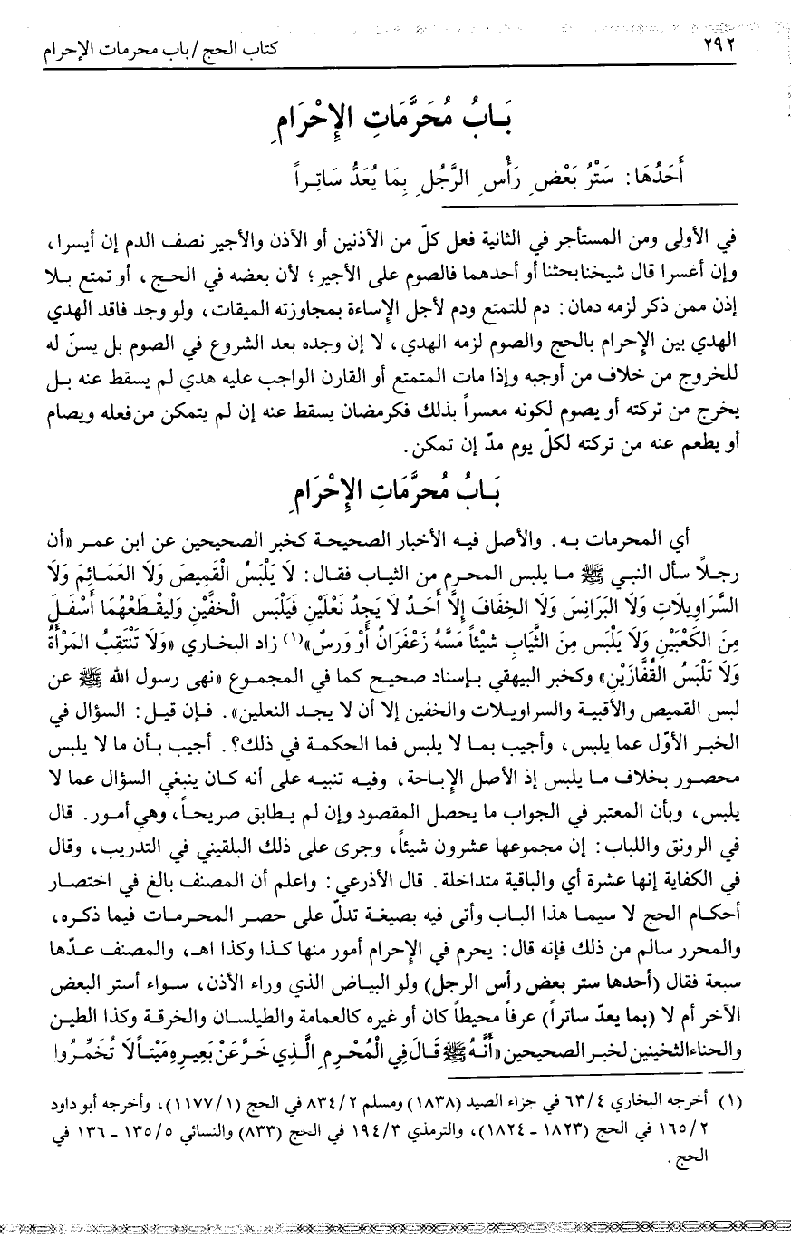 أَكْثَرُ بَابُ مُحَرَّمَاتِ الْإِحْرَامِ أَيْ الْمُحَرَّمَاتِ بِهِ. وَالْأَصْلُ فِيهِ الْأَخْبَارُ الصَّحِيحَةُ كَخَبَرِ الصَّحِيحَيْنِ عَنْ ابْنِ عُمَرَ «أَنَّ رَجُلًا سَأَلَ النَّبِيَّ - صَلَّى اللَّهُ عَلَيْهِ وَسَلَّمَ - مَا يَلْبَسُ الْمُحْرِمُ مِنْ الثِّيَابِ فَقَالَ: لَا يَلْبَسُ الْقَمِيصَ وَلَا الْعَمَائِمَ وَلَا السَّرَاوِيلَاتِ وَلَا الْبَرَانِسَ وَلَا الْخِفَافَ إلَّا أَحَدٌ لَا يَجِدُ نَعْلَيْنِ فَيَلْبَسُ الْخُفَّيْنِ وَلْيَقْطَعْهُمَا أَسْفَلَ مِنْ الْكَعْبَيْنِ وَلَا يَلْبَسُ مِنْ الثِّيَابِ شَيْئًا مَسَّهُ زَعْفَرَانٌ أَوْ وَرْسٌ» زَادَ الْبُخَارِيُّ، " وَلَا تَنْتَقِبُ الْمَرْأَةُ وَلَا تَلْبَسُ الْقُفَّازَيْنِ " وَكَخَبَرِ الْبَيْهَقِيّ بِإِسْنَادٍ صَحِيحٍ كَمَا فِي الْمَجْمُوعِ «نَهَى رَسُولُ اللَّهِ - صَلَّى اللَّهُ عَلَيْهِ وَسَلَّمَ - عَنْ لُبْسِ الْقَمِيصِ وَالْأَقْبِيَةِ وَالسَّرَاوِيلَاتِ وَالْخُفَّيْنِ إلَّا أَنْ لَا يَجِدَ النَّعْلَيْنِ» . فَإِنْ قِيلَ: السُّؤَالُ فِي الْخَبَرِ الْأَوَّلِ عَمَّا يُلْبَسُ،