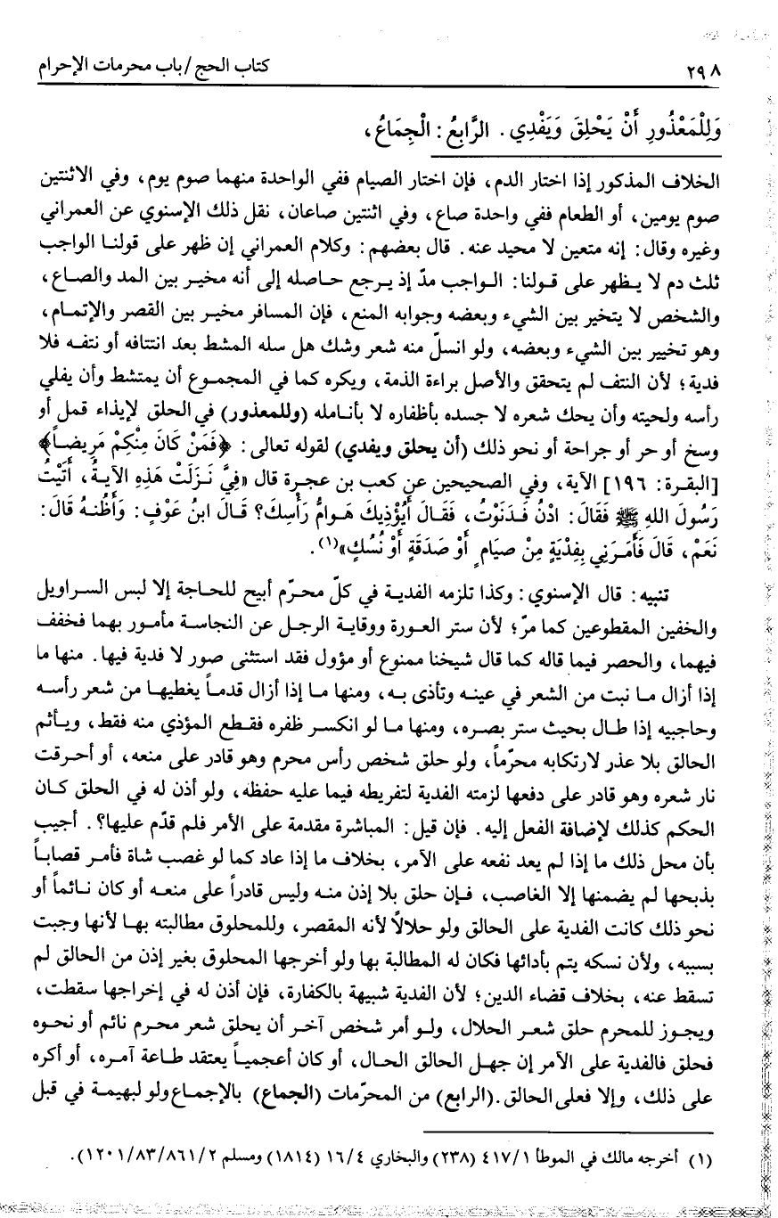 ـــــــــــــــــــــــــــــQالْخِلَافِ الْمَذْكُورِ إذَا اخْتَارَ الدَّمَ، فَإِنْ اخْتَارَ الصِّيَامَ فَفِي الْوَاحِدَةِ مِنْهُمَا صَوْمُ يَوْمٍ، وَفِي الِاثْنَتَيْنِ صَوْمُ يَوْمَيْنِ، أَوْ الطَّعَامَ فَفِي وَاحِدَةٍ صَاعٌ، وَفِي اثْنَتَيْنِ صَاعَانِ، نَقَلَ ذَلِكَ الْإِسْنَوِيُّ عَنْ الْعِمْرَانِيِّ وَغَيْرِهِ وَقَالَ: إنَّهُ مُتَعَيَّنٌ لَا مَحِيدَ عَنْهُ. قَالَ بَعْضُهُمْ: وَكَلَامُ الْعِمْرَانِيِّ إنْ ظَهَرَ عَلَى قَوْلِنَا: الْوَاجِبُ ثُلُثُ دَمٍ لَا يَظْهَرُ عَلَى قَوْلِنَا: الْوَاجِبُ مُدٌّ إذْ يَرْجِعُ حَاصِلُهُ إلَى أَنَّهُ مُخَيَّرٌ بَيْنَ الْمُدِّ وَالصَّاعِ، وَالشَّخْصُ لَا يَتَخَيَّرُ بَيْنَ الشَّيْءِ وَبَعْضِهِ وَجَوَابُهُ الْمَنْعُ، فَإِنَّ الْمُسَافِرَ مُخَيَّرٌ بَيْنَ الْقَصْرِ وَالْإِتْمَامِ، وَهُوَ تَخْيِيرٌ بَيْنَ الشَّيْءِ وَبَعْضِهِ، وَلَوْ انْسَلَّ مِنْهُ شَعْرٌ وَشَكَّ هَلْ سَلَّهُ الْمُشْطِ بَعْدَ انْتِتَافِهِ أَوْ نَتَفَهُ فَلَا فِدْيَةَ؛ لِأَنَّ النَّتْفَ لَمْ يَتَحَقَّقْ وَالْأَصْلُ بَرَاءَةُ الذِّمَّةِ، وَيُكْرَهُ كَمَا فِي الْمَجْمُوعِ أَنْ يَمْتَشِطَ وَأَنْ يُفْلِي رَأْسَهُ وَلِحْيَتَهُ وَأَنْ يَحُكَّ شَعْرَهُ لَا جَسَدَهُ بِأَظْفَارِهِ لَا بِأَنَامِلِهِ (وَلِلْمَعْذُورِ) فِي الْحَلْقِ لِإِيذَاءِ قَمْلٍ أَوْ وَسَخٍ أَوْ حَرٍّ أَوْ جِرَاحَةٍ أَوْ نَحْوِ ذَلِكَ (أَنْ يَحْلِقَ وَيَفْدِيَ) لِقَوْلِهِ تَعَالَى: {فَمَنْ كَانَ مِنْكُمْ مَرِيضًا} [البقرة: 184] ، وَفِي الصَّحِيحَيْنِ عَنْ كَعْبِ بْنِ عُجْرَةَ قَالَ فِي نَزَلَتْ هَذِهِ الْآيَةُ، «أَتَيْتُ رَسُولَ اللَّهِ - صَلَّى اللَّهُ عَلَيْهِ وَسَلَّمَ - فَقَالَ: اُدْنُ فَدَنَوْتُ، فَقَالَ أَيُؤْذِيكَ هَوَامُّ رَأْسِكَ؟ قَالَ ابْنُ عَوْفٍ: وَأَظُنُّهُ قَالَ: نَعَمْ، قَالَ فَأَمَرَنِي بِفِدْيَةٍ مِنْ صِيَامٍ أَوْ صَدَقَةٍ أَوْ نُسُكٍ» .