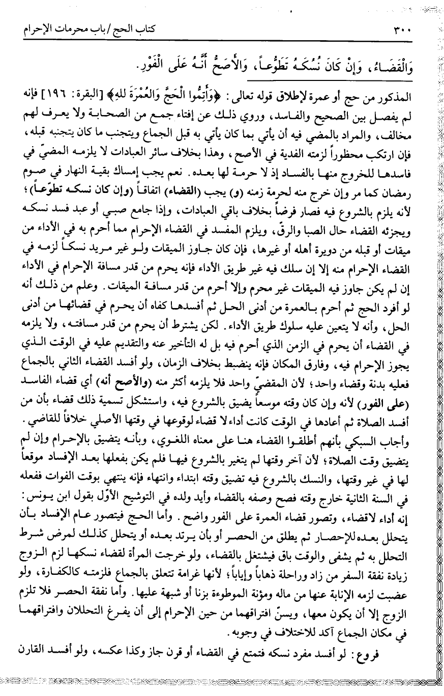 ـــــــــــــــــــــــــــــQالْمَذْكُورِ مِنْ حَجٍّ أَوْ عُمْرَةٍ لِإِطْلَاقِ قَوْله تَعَالَى: {وَأَتِمُّوا الْحَجَّ وَالْعُمْرَةَ لِلَّهِ} [البقرة: 196] فَإِنَّهُ لَمْ يَفْصِلْ بَيْنَ الصَّحِيحِ وَالْفَاسِدِ، وَرُوِيَ ذَلِكَ عَنْ إفْتَاءِ جَمْعٍ مِنْ الصَّحَابَةِ وَلَا يُعْرَفُ لَهُمْ مُخَالِفٌ، وَالْمُرَادُ بِالْمُضِيِّ فِيهِ أَنْ يَأْتِيَ بِمَا كَانَ يَأْتِي بِهِ قَبْلَ الْجِمَاعِ وَيَتَجَنَّبَ مَا كَانَ يَتَجَنَّبُهُ قَبْلَهُ، فَإِنْ ارْتَكَبَ مَحْظُورًا لَزِمَتْهُ الْفِدْيَةُ فِي الْأَصَحِّ، وَهَذَا بِخِلَافِ سَائِرِ الْعِبَادَاتِ لَا يَلْزَمُهُ الْمُضِيُّ فِي فَاسِدِهَا لِلْخُرُوجِ مِنْهَا بِالْفَسَادِ إذْ لَا حُرْمَةَ لَهَا بَعْدَهُ.