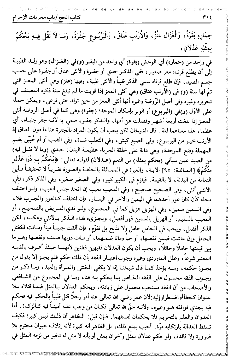 (وَمَا لَا نَقْلَ فِيهِ) مِنْ الصَّيْدِ عَمَّنْ سَيَأْتِي (يَحْكُمُ بِمِثْلِهِ) مِنْ النَّعَمِ (عَدْلَانِ) لِقَوْلِهِ تَعَالَى: {يَحْكُمُ بِهِ ذَوَا عَدْلٍ مِنْكُمْ} [المائدة: 95] ، وَالْعِبْرَةُ فِي الْمُمَاثَلَةِ بِالْخِلْقَةِ وَالصُّورَةِ تَقْرِيبًا لَا تَحْقِيقًا فَأَيْنَ النَّعَامَةُ مِنْ الْبَدَنَةِ، لَا بِالْقِيمَةِ. فَيَلْزَمُ فِي الْكَبِيرِ كَبِيرٌ، وَفِي الصَّغِيرِ صَغِيرٌ، وَفِي الذَّكَرِ ذَكَرٌ، وَفِي الْأُنْثَى أُنْثَى، وَفِي الصَّحِيحِ صَحِيحٌ، وَفِي الْمَعِيبِ مَعِيبٌ إنْ اتَّحَدَ جِنْسُ الْعَيْبِ، وَلَوْ اخْتَلَفَ مَحَلُّهُ كَأَنْ كَانَ عَوَرُ أَحَدِهِمَا فِي الْيَمِينِ وَالْآخَرِ فِي الْيَسَارِ، فَإِنْ اخْتَلَفَ كَالْعَوَرِ وَالْجَرَبِ فَلَا، وَفِي السَّمِينِ سَمِينٌ، وَفِي الْهَزِيلِ هَزِيلٌ كَمَا فِي الْمَجْمُوعِ، وَلَوْ فُدِيَ الْمَرِيضُ بِالصَّحِيحِ، أَوْ الْمَعِيبُ بِالسَّلِيمِ، أَوْ الْهَزِيلُ بِالسَّمِينِ فَهُوَ أَفْضَلُ، وَيُجْزِئُ فِدَاءُ الذَّكَرِ بِالْأُنْثَى وَعَكْسُهُ، لَكِنَّ الذَّكَرَ أَفْضَلُ، وَيَجِبُ فِي الْحَامِلِ حَامِلٌ وَلَا تُذْبَحُ بَلْ تُقَوَّمُ، فَإِنْ أَلْقَتْ جَنِينًا مَيِّتًا وَمَاتَتْ فَكَقَتْلِ الْحَامِلِ وَإِنْ عَاشَتْ ضَمِنَ نَقْصَهَا، أَوْ حَيًّا وَمَاتَا ضَمِنَهُمَا، أَوْ مَاتَ دُونَهَا ضَمِنَهُ وَنَقْصَهَا وَهُوَ مَا بَيْنَ قِيمَتِهَا حَامِلًا وَحَائِلًا، وَيَجِبُ أَنْ يَكُونَ الْعَدْلَانِ فَقِيهَيْنِ فَطِنَيْنِ لِأَنَّهُمَا حِينَئِذٍ أَعْرَفُ بِالشَّبَهِ الْمُعْتَبَرِ شَرْعًا، وَعَلَّلَ الْمَاوَرْدِيُّ وَغَيْرُهُ وُجُوبَ اعْتِبَارِ الْفِقْهِ بِأَنَّ ذَلِكَ حُكْمٌ فَلَمْ يَجُزْ إلَّا بِقَوْلِ مَنْ يَجُوزُ حُكْمُهُ، وَمِنْهُ يُؤْخَذُ كَمَا قَالَ شَيْخُنَا إنَّهُ لَا يَكْفِي الْخُنْثَى وَالْمَرْأَةُ وَالْعَبْدُ، وَمَا ذُكِرَ مِنْ وُجُوبِ الْفِقْهِ مَحْمُولٌ عَلَى الْفِقْهِ الْخَاصِّ بِمَا يُحْكَمُ بِهِ هُنَا.