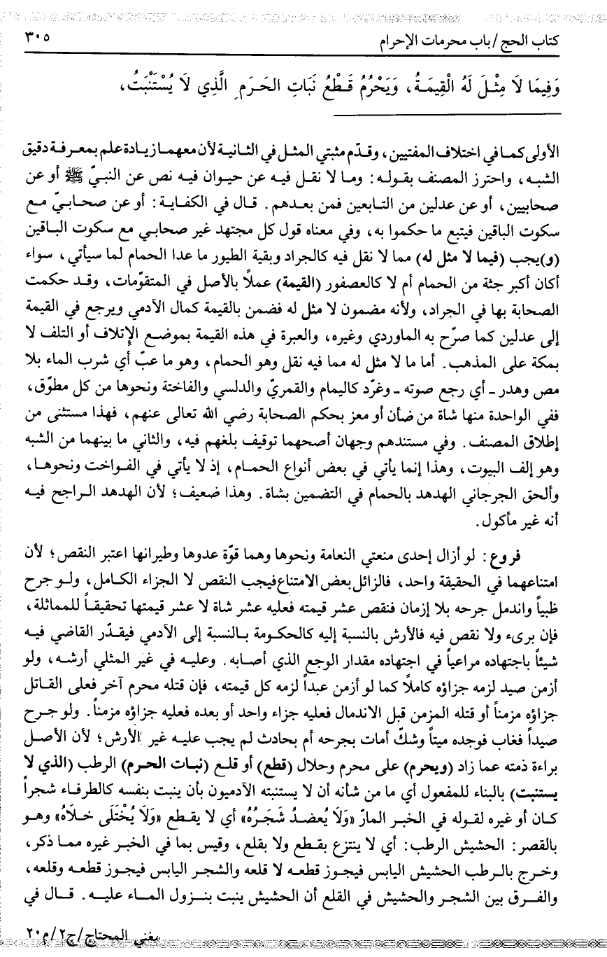 (وَيَحْرُمُ) عَلَى مُحْرِمٍ وَحَلَالٍ (قَطْعُ) أَوْ قَلْعُ (نَبَاتِ الْحَرَمِ) الرَّطْبِ (الَّذِي لَا يُسْتَنْبَتُ) بِالْبِنَاءِ لِلْمَفْعُولِ أَيْ مَا مِنْ شَأْنِهِ أَنْ لَا يَسْتَنْبِتَهُ الْآدَمِيُّونَ بِأَنْ يَنْبُتَ بِنَفْسِهِ كَالطَّرْفَاءِ شَجَرًا كَانَ أَوْ غَيْرَهُ لِقَوْلِهِ فِي الْخَبَرِ الْمَارِّ " وَلَا يُعْضَدُ شَجَرُهُ " أَيْ لَا يُقْطَعُ " وَلَا يُخْتَلَى خَلَاهُ " وَهُوَ بِالْقَصْرِ: الْحَشِيشُ الرَّطْبُ: أَيْ لَا يُنْتَزَعُ بِقَطْعٍ وَلَا بِقَلْعٍ، وَقِيسَ بِمَا فِي الْخَبَرِ غَيْرُهُ مِمَّا ذُكِرَ، وَخَرَجَ بِالرَّطْبِ الْحَشِيشُ الْيَابِسُ فَيَجُوزُ قَطْعُهُ لَا قَلْعُهُ وَالشَّجَرُ الْيَابِسُ فَيَجُوزُ قَطْعُهُ وَقَلْعُهُ، وَالْفَرْقُ بَيْنَ الشَّجَرِ وَالْحَشِيشِ فِي الْقَلْعِ أَنَّ الْحَشِيشَ يَنْبُتُ بِنُزُولِ الْمَاءِ عَلَيْهِ. قَالَ فِي