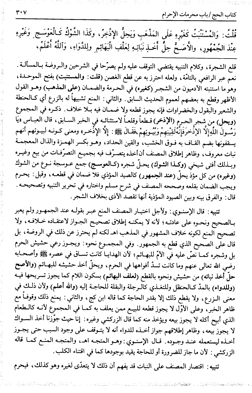 وَيَحِلُّ الْإِذْخِرُ، وَكَذَا الشَّوْكُ كَالْعَوْسَجِ وَغَيْرِهِ عِنْدَ الْجُمْهُورِ، وَالْأَصَحُّ حِلُّ أَخْذِ نَبَاتِهِ لِعَلْفِ الْبَهَائِمِ وَلِلدَّوَاءِ، وَاَللَّهُ أَعْلَمُ.