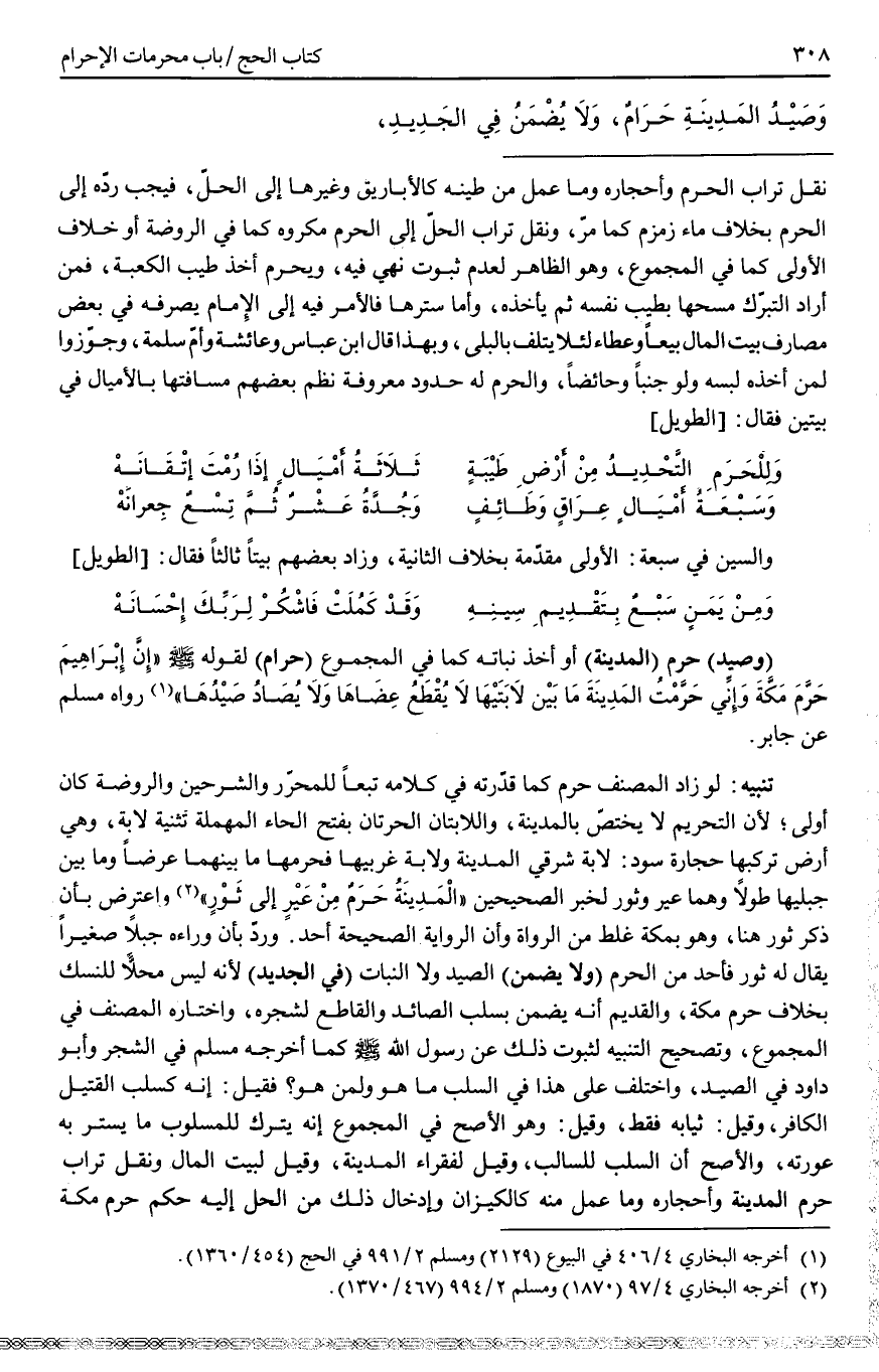 (وَصَيْدُ) حَرَمِ (الْمَدِينَةِ) أَوْ أَخْذُ نَبَاتِهِ كَمَا فِي الْمَجْمُوعِ (حَرَامٌ) لِقَوْلِهِ - صَلَّى اللَّهُ عَلَيْهِ وَسَلَّمَ - «إنَّ إبْرَاهِيمَ حَرَّمَ مَكَّةَ وَإِنِّي حَرَّمْتُ الْمَدِينَةَ مَا بَيْنَ لَابَتَيْهَا لَا يُقْطَعُ عِضَاهَا وَلَا يُصَادُ صَيْدُهَا» رَوَاهُ مُسْلِمٌ عَنْ جَابِرٍ.