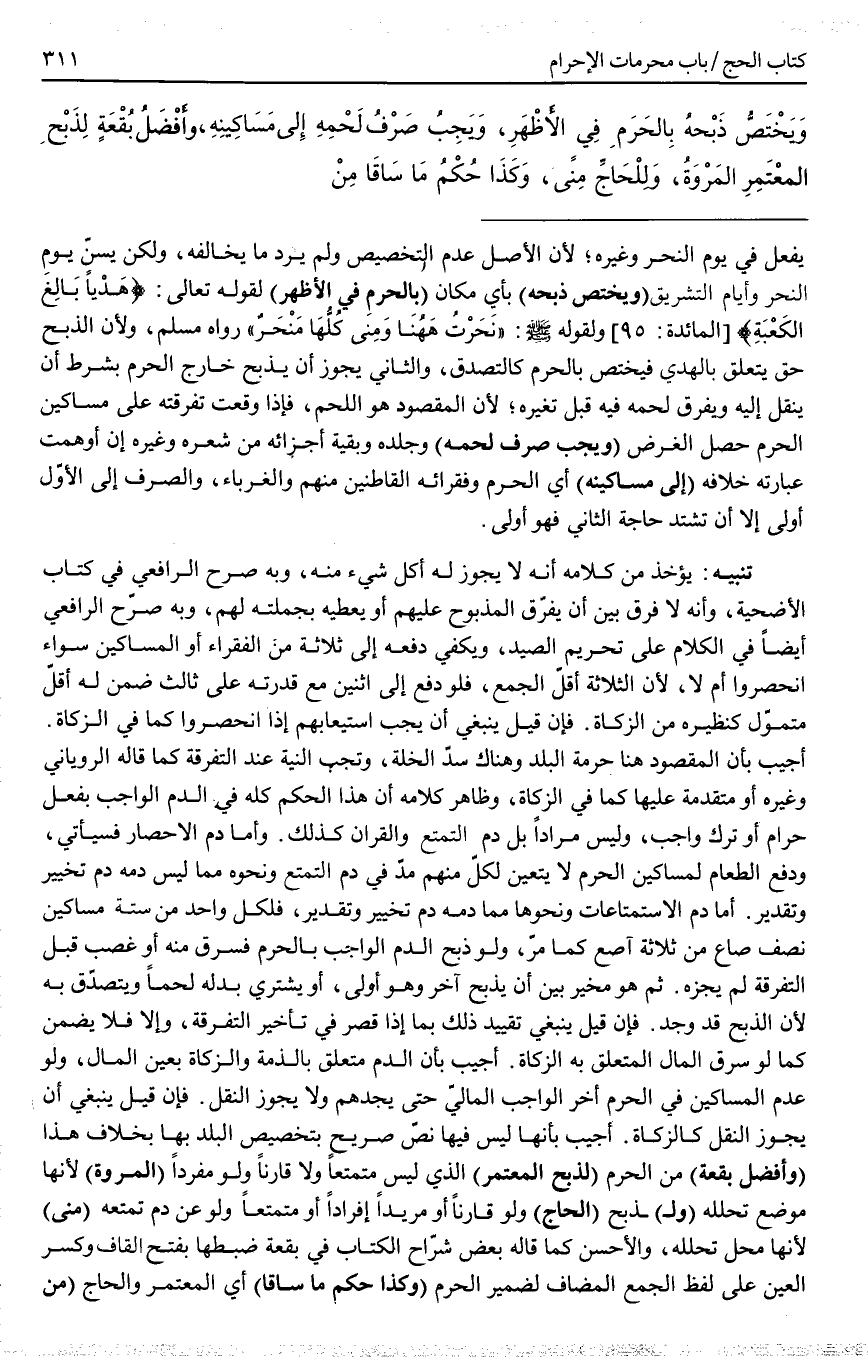 أُجِيبَ بِأَنَّ الْمَقْصُودَ هُنَا حُرْمَةُ الْبَلَدِ وَهُنَاكَ سَدُّ الْخَلَّةِ، وَتَجِبُ النِّيَّةُ عِنْدَ التَّفْرِقَةِ كَمَا قَالَ الرُّويَانِيُّ وَغَيْرُهُ أَوْ مُتَقَدِّمَةً عَلَيْهَا كَمَا فِي الزَّكَاةِ، وَظَاهِرُ كَلَامِهِ أَنَّ هَذَا الْحُكْمَ كُلَّهُ فِي الدَّمِ الْوَاجِبِ بِفِعْلِ حَرَامٍ أَوْ تَرْكِ وَاجِبٍ، وَلَيْسَ مُرَادًا بَلْ دَمُ التَّمَتُّعِ وَالْقِرَانِ كَذَلِكَ وَأَمَّا دَمُ الْإِحْصَارِ فَسَيَأْتِي، وَدَفْعُ الطَّعَامِ لِمَسَاكِينِ الْحَرَمِ لَا يَتَعَيَّنُ لِكُلٍّ مِنْهُمْ مُدٌّ فِي دَمِ التَّمَتُّعِ وَنَحْوِهِ مِمَّا لَيْسَ دَمُهُ دَمَ تَخْيِيرٍ وَتَقْدِيرٍ. أَمَّا دَمُ الِاسْتِمْتَاعَاتِ وَنَحْوِهَا مِمَّا دَمُهُ دَمُ تَخْيِيرٍ وَتَقْدِيرٍ، فَلِكُلِّ وَاحِدٍ مِنْ سِتَّةِ مَسَاكِينَ نِصْفُ صَاعٍ مِنْ ثَلَاثَةِ آصُعٍ كَمَا مَرَّ وَلَوْ ذَبَحَ الدَّمَ الْوَاجِبَ بِالْحَرَمِ فَسُرِقَ مِنْهُ أَوْ غُصِبَ قَبْلَ التَّفْرِقَةِ لَمْ يُجْزِهِ. ثُمَّ هُوَ مُخَيَّرٌ بَيْنَ أَنْ يَذْبَحَ آخَرَ وَهُوَ أَوْلَى، أَوْ يَشْتَرِيَ بَدَلَهُ لَحْمًا وَيَتَصَدَّقَ بِهِ لِأَنَّ الذَّبْحَ قَدْ وُجِدَ. فَإِنْ قِيلَ يَنْبَغِي تَقْيِيدُ ذَلِكَ بِمَا إذَا قَصَّرَ فِي تَأْخِيرِ التَّفْرِقَةِ، وَإِلَّا فَلَا يَضْمَنُ كَمَا لَوْ سُرِقَ الْمَالُ الْمُتَعَلِّقُ بِهِ الزَّكَاةُ.