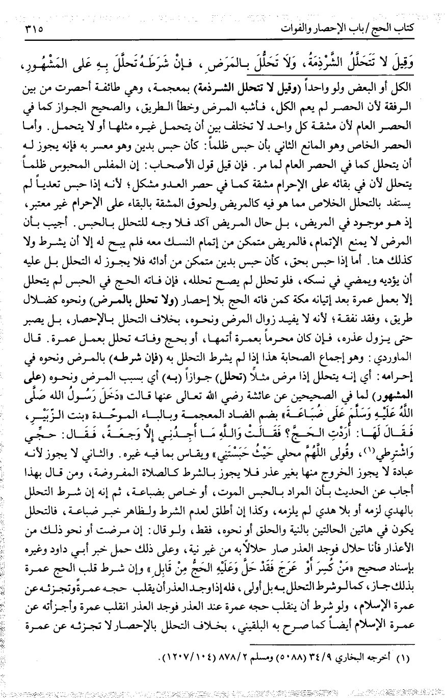 (وَلَا تَحَلُّلَ بِالْمَرَضِ) وَنَحْوِهِ كَضَلَالِ طَرِيقٍ، وَفَقْدِ نَفَقَةٍ؛ لِأَنَّهُ لَا يُفِيدُ زَوَالَ الْمَرَضِ وَنَحْوِهِ، بِخِلَافِ التَّحَلُّلِ بِالْإِحْصَارِ، بَلْ يَصْبِرُ حَتَّى يَزُولَ عُذْرُهُ، فَإِنْ كَانَ مُحْرِمًا بِعُمْرَةٍ أَتَمَّهَا، أَوْ بِحَجٍّ وَفَاتَهُ تَحَلُّلٌ بِعَمَلِ عُمْرَةٍ. قَالَ الْمَاوَرْدِيُّ: وَهُوَ إجْمَاعُ الصَّحَابَةِ هَذَا إذَا لَمْ يُشْرَطْ التَّحَلُّلُ بِهِ (فَإِنْ شَرَطَهُ) بِالْمَرَضِ وَنَحْوِهِ فِي إحْرَامِهِ: أَيْ أَنَّهُ يَتَحَلَّلُ إذَا مَرِضَ مَثَلًا (تَحَلَّلَ) جَوَازًا (بِهِ) أَيْ بِسَبَبِ الْمَرَضِ وَنَحْوِهِ (عَلَى الْمَشْهُورِ) لِمَا فِي الصَّحِيحَيْنِ عَنْ عَائِشَةَ - رَضِيَ اللَّهُ تَعَالَى عَنْهَا - قَالَتْ " دَخَلَ رَسُولُ اللَّهِ - صَلَّى اللَّهُ عَلَيْهِ وَسَلَّمَ - عَلَى ضُبَاعَةَ " بِضَمِّ الضَّادِ الْمُعْجَمَةِ وَبِالْبَاءِ الْمُوَحَّدَةِ " بِنْتِ الزُّبَيْرِ، فَقَالَ لَهَا: «أَرَدْتِ الْحَجَّ؟ فَقَالَتْ وَاَللَّهِ مَا أَجِدُنِي إلَّا وَجِعَةً، فَقَالَ: حُجِّي وَاشْتَرِطِي، وَقُولِي اللَّهُمَّ مَحِلِّي حَيْثُ حَبَسْتَنِي» وَيُقَاسُ بِمَا فِيهِ غَيْرُهُ. وَالثَّانِي لَا يَجُوزُ لِأَنَّهُ عِبَادَةٌ لَا يَجُوزُ الْخُرُوجُ مِنْهَا بِغَيْرِ عُذْرٍ فَلَا يَجُوزُ بِالشَّرْطِ كَالصَّلَاةِ الْمَفْرُوضَةِ، وَمَنْ قَالَ بِهَذَا أَجَابَ عَنْ الْحَدِيثِ بِأَنَّ الْمُرَادَ بِالْحَبْسِ الْمَوْتُ أَوْ خَاصٌّ بِضُبَاعَةَ، ثُمَّ إنَّهُ إنْ شَرَطَ التَّحَلُّلَ بِالْهَدْيِ لَزِمَهُ أَوْ بِلَا هَدْيٍ لَمْ يَلْزَمْهُ وَكَذَا إنْ أَطْلَقَ لِعَدَمِ الشَّرْطِ وَلِظَاهِرِ خَبَرِ ضُبَاعَةَ، فَالتَّحَلُّلُ يَكُونُ فِي هَاتَيْنِ الْحَالَتَيْنِ بِالنِّيَّةِ وَالْحَلْقِ أَوْ نَحْوِهِ فَقَطْ، وَلَوْ قَالَ: إنْ مَرِضْت أَوْ نَحْوَ ذَلِكَ مِنْ الْأَعْذَارِ فَأَنَا حَلَالٌ فَوَجَدَ الْعُذْرَ صَارَ حَلَالًا بِهِ مِنْ غَيْرِ نِيَّةٍ، وَعَلَى ذَلِكَ حَمْلُ خَبَرِ أَبِي دَاوُد وَغَيْرِهِ بِإِسْنَادٍ صَحِيحٍ «مَنْ كُسِرَ أَوْ عَرِجَ فَقَدْ حَلَّ وَعَلَيْهِ الْحَجُّ مِنْ قَابِلٍ» وَإِنْ شَرَطَ قَلْبَ الْحَجِّ عُمْرَةً بِذَلِكَ جَازَ، كَمَا لَوْ شَرَطَ التَّحَلُّلَ بِهِ بَلْ أَوْلَى، فَلَهُ إذَا وَجَدَ الْعُذْرَ أَنْ يَقْلِبَ حَجَّهُ عُمْرَةً وَتُجْزِئُهُ عَنْ عُمْرَةِ الْإِسْلَامِ.