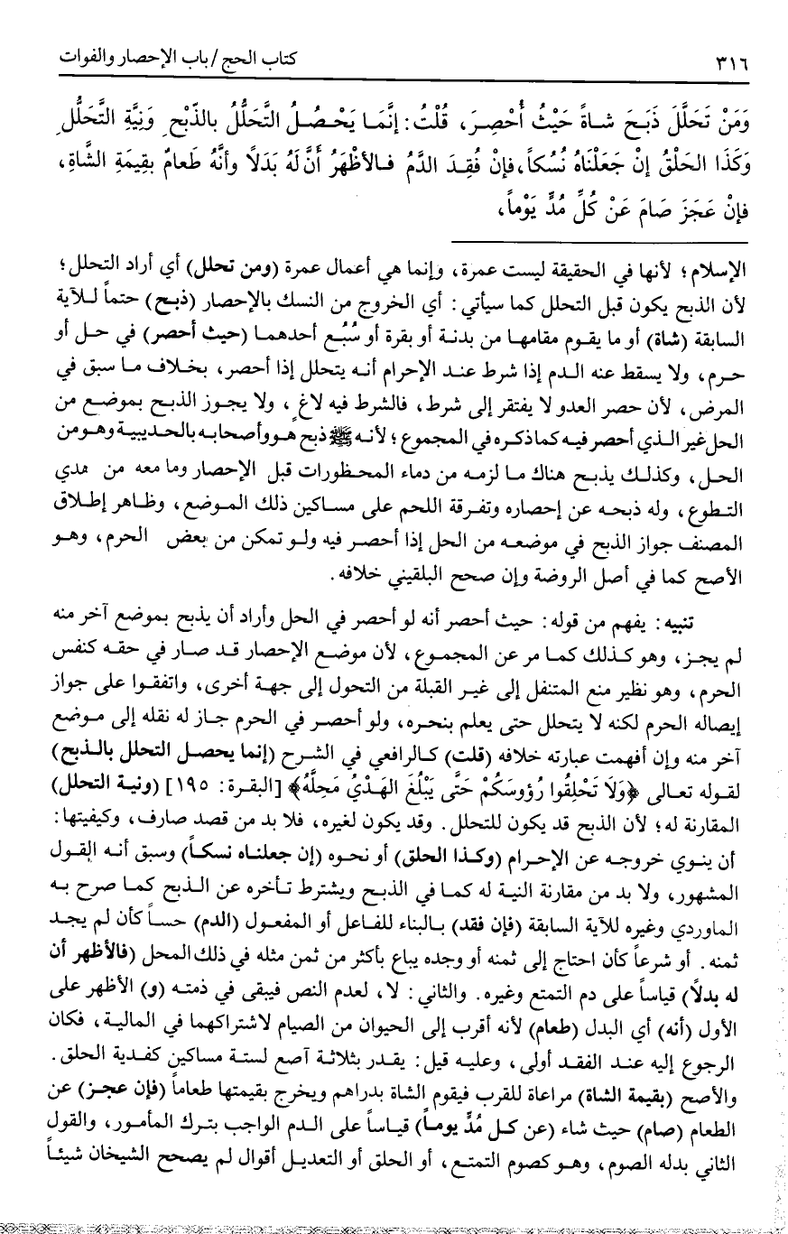 ـــــــــــــــــــــــــــــQالْإِسْلَامِ؛ لِأَنَّهَا فِي الْحَقِيقَةِ لَيْسَتْ عُمْرَةً، وَإِنَّمَا هِيَ أَعْمَالُ عُمْرَةٍ (وَمَنْ تَحَلَّلَ) أَيْ أَرَادَ التَّحَلُّلَ؛ لِأَنَّ الذَّبْحَ يَكُونُ قَبْلَ التَّحَلُّلِ كَمَا سَيَأْتِي: أَيْ الْخُرُوجُ مِنْ النُّسُكِ بِالْإِحْصَارِ (ذَبَحَ) حَتْمًا لِلْآيَةِ السَّابِقَةِ (شَاةً) أَوْ مَا يَقُومُ مَقَامَهَا مِنْ بَدَنَةٍ أَوْ بَقَرَةٍ أَوْ سُبُعِ أَحَدِهِمَا (حَيْثُ أُحْصِرَ) فِي حِلٍّ أَوْ حَرَمٍ، وَلَا يَسْقُطُ عَنْهُ الدَّمُ إذَا شَرَطَ عِنْدَ الْإِحْرَامِ أَنَّهُ يَتَحَلَّلُ إذَا أُحْصِرَ، بِخِلَافِ مَا سَبَقَ فِي الْمَرَضِ، لِأَنَّ حَصْرَ الْعَدُوِّ لَا يَفْتَقِرُ إلَى شَرْطٍ، فَالشَّرْطُ فِيهِ لَاغٍ.