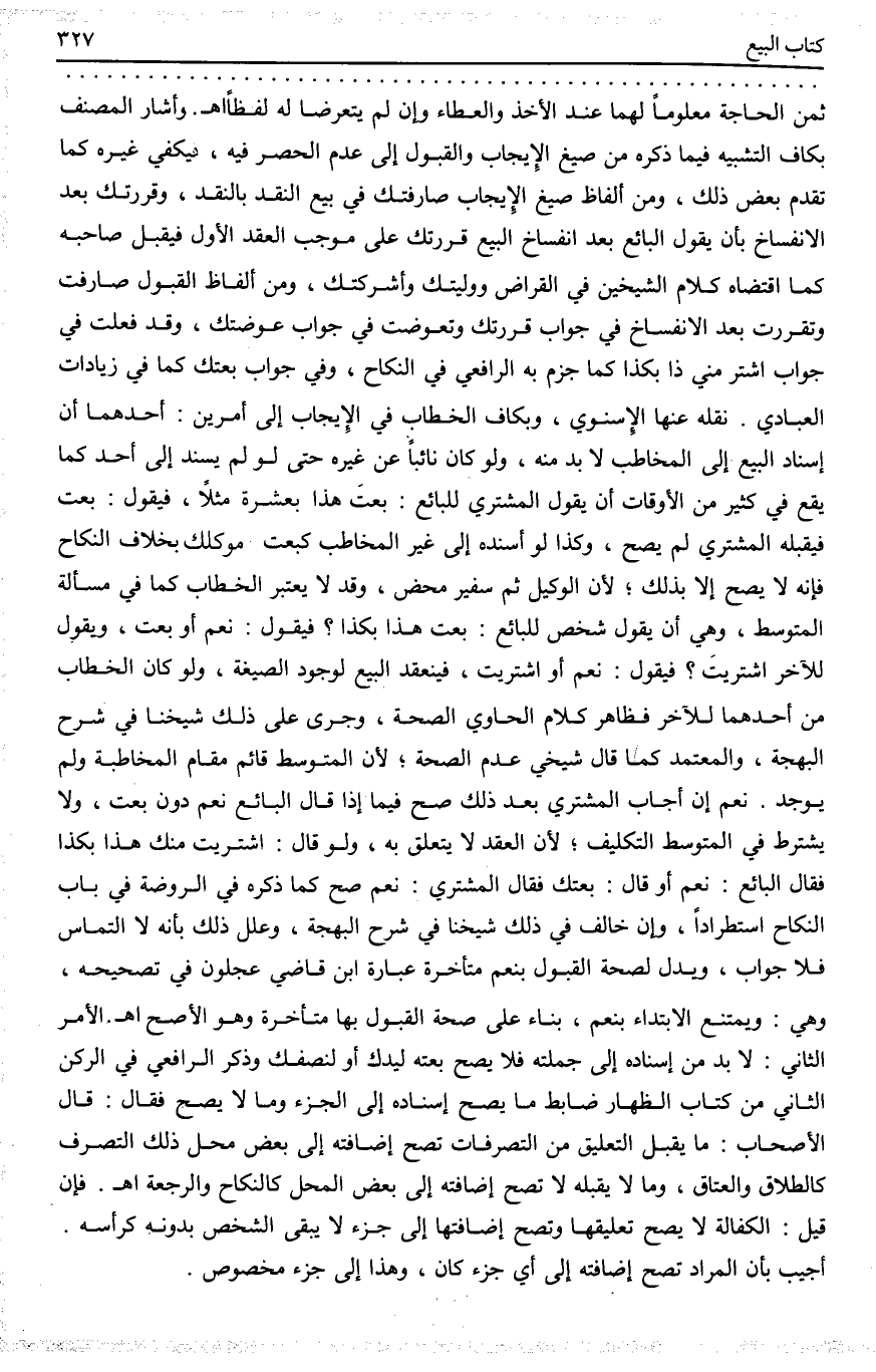 قَالَ الْإِمَامُ: وَجَبَ الْقَطْعُ بِصِحَّتِهِ، وَالنِّكَاحُ وَبَيْعُ الْوَكِيلِ الْمَشْرُوطِ فِيهِ الْإِشْهَادُ لَا يَنْعَقِدَانِ بِهَا؛ لِأَنَّ الشُّهُودَ لَا يَطَّلِعُونَ عَلَى النِّيَّةِ. نَعَمْ إنْ تَوَفَّرَتْ الْقَرَائِنُ عَلَيْهِ فِي الثَّانِيَةِ. قَالَ الْغَزَالِيُّ: فَالظَّاهِرُ انْعِقَادُهُ وَأَقَرَّهُ عَلَيْهِ فِي الرَّوْضَةِ، وَهُوَ الْمُعْتَمَدُ خِلَافًا لِمَا جَرَى عَلَيْهِ صَاحِبُ الْأَنْوَارِ مِنْ عَدَمِ الصِّحَّةِ، وَالْفَرْقُ بَيْنَهُ وَبَيْنَ النِّكَاحِ أَنَّ النِّكَاحَ يُحْتَاطُ لَهُ أَكْثَرَ، وَصُورَةُ الشَّرْطِ أَنْ يَقُولَ: بِعْ هَذَا عَلَى أَنْ تُشْهِدَ. فَإِنْ قَالَ: بِعْ وَأَشْهِدْ لَمْ يَكُنْ الْإِشْهَادُ شَرْطًا صَرَّحَ بِذَلِكَ الْمَرْعَشِيُّ، وَاقْتَضَاهُ كَلَامُ غَيْرِهِ وَالْكِتَابَةُ بِالْبَيْعِ وَنَحْوِهِ عَلَى نَحْوِ لَوْحٍ أَوْ وَرَقٍ أَوْ أَرْضٍ كِنَايَةٌ فِي ذَلِكَ، فَيَنْعَقِدُ بِهَا مَعَ النِّيَّةِ بِخِلَافِ الْكِتَابَةِ عَلَى الْمَائِعِ وَنَحْوِهِ كَالْهَوَاءِ، فَإِنَّهُ لَا يَكُونُ كِنَايَةً لِأَنَّهَا لَا تَثْبُتُ، وَيُشْتَرَطُ الْقَبُولُ مِنْ الْمَكْتُوبِ إلَيْهِ حَالَ الِاطِّلَاعِ لِيَقْتَرِنَ بِالْإِيجَابِ بِقَدْرِ الْإِمْكَانِ. فَإِذَا قَبِلَ فَلَهُ الْخِيَارُ مَا دَامَ فِي مَجْلِسِ قَبُولِهِ، وَيَثْبُتُ الْخِيَارُ لِلْكَاتِبِ مُمْتَدًّا إلَى أَنْ يَنْقَطِعَ خِيَارُ صَاحِبِهِ حَتَّى لَوْ عَلِمَ أَنَّهُ رَجَعَ عَنْ الْإِيجَابِ قَبْلَ مُفَارَقَةِ الْمَكْتُوبِ إلَيْهِ مَجْلِسَهُ صَحَّ رُجُوعُهُ وَلَمْ يَنْعَقِدْ الْبَيْعُ: أَيْ لَمْ يَسْتَمِرَّ وَإِنْ كَتَبَ بِذَلِكَ لِحَاضِرٍ صَحَّ أَيْضًا فِي أَحَدِ وَجْهَيْنِ، رَجَّحَهُ الزَّرْكَشِيُّ كَالسُّبْكِيِّ وَهُوَ الْمُعْتَمَدُ، وَلَوْ بَاعَ مِنْ غَائِبٍ كَأَنْ قَالَ: بِعْت دَارًا لِفُلَانٍ وَهُوَ غَائِبٌ فَقَبِلَ حِينَ بَلَغَهُ الْخَبَرُ صَحَّ كَمَا لَوْ كَاتَبَهُ بَلْ أَوْلَى. .