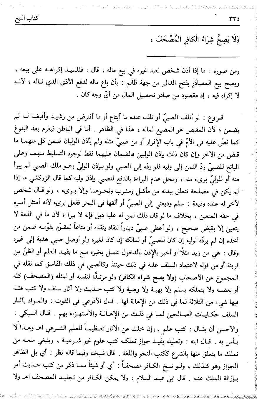 ـــــــــــــــــــــــــــــQمُجَرَّدُ اسْتِيثَاقٍ. قَالَ ابْنُ الْمُقْرِي: وَتُرْفَعُ يَدُهُ عَنْهُمَا فَيُوضَعَانِ عِنْدَ عَدْلٍ، وَقَضِيَّتُهُ أَنَّهُ يَتَسَلَّمُهُمَا أَوَّلًا، وَقَضِيَّةُ كَلَامِ الرَّوْضَةِ أَنَّهُ لَا يُمَكَّنُ مِنْ ذَلِكَ بَلْ يُسَلَّمُ أَوَّلًا لِلْعَدْلِ، قَالَ الْأَذْرَعِيُّ: وَيُحْتَمَلُ أَنْ يُقَالَ: وَيُسَلَّمُ إلَيْهِ الرَّقِيقُ ثُمَّ يُنْزَعُ حَالًا إذْ لَا مَحْذُورَ كَمَا فِي إيدَاعِهِ مِنْهُ بِخِلَافِ الْمُصْحَفِ، فَإِنَّهُ مُحْدِثٌ مُكَلَّفٌ فَلَا يُسَلَّمُ إلَيْهِ، وَهَذَا كَمَا قَالَ شَيْخُنَا مُتَّجَهٌ، وَيَنْبَغِي أَنْ يَكُونَ غَيْرُ الْمُصْحَفِ مِمَّا أُلْحِقَ بِهِ كَالْعَبْدِ أَخْذًا مِنْ الْعِلَّةِ، وَلَا يَصِحُّ شِرَاءُ الْكَافِرِ رَقِيقًا مُسْلِمًا بِشَرْطِ الْإِعْتَاقِ، لِأَنَّهُ لَا يَسْتَعْقِبُ الْعِتْقَ، وَلَوْ أَسْلَمَ رَقِيقُ الْكَافِرِ أُمِرَ بِإِزَالَةِ الْمِلْكِ عَنْهُ بِبَيْعٍ أَوْ هِبَةٍ أَوْ عِتْقٍ أَوْ وَقْفٍ أَوْ نَحْوِ ذَلِكَ دَفْعًا لِلْإِهَانَةِ وَالْإِذْلَالِ وَقَطْعًا لِسَلْطَنَةِ الْكَافِرِ عَلَى الْمُسْلِمِ، وَلَا يُحْكَمُ بِزَوَالِ مِلْكِهِ بِخِلَافِ مَا لَوْ أَسْلَمَتْ، الزَّوْجَةُ تَحْتَ كَافِرٍ إذْ مِلْكُ النِّكَاحِ لَا يَقْبَلُ النَّقْلَ فَتَعَيَّنَ الْبُطْلَانُ بِخِلَافِ مِلْكِ الْيَمِينِ، وَلَا يَكْفِي رَهْنُهُ وَلَا إجَارَتُهُ وَلَا تَزْوِيجُهُ وَلَا تَدْبِيرُهُ وَنَحْوُ ذَلِكَ لِأَنَّهَا لَا تُفِيدُ الِاسْتِقْلَالَ، وَهَلْ الْمُرَادُ أَنَّ ذَلِكَ لَا يَصِحُّ أَوْ يَصِحُّ؟ لَكِنَّهُ لَا يَكْفِي. قَالَ الزَّرْكَشِيُّ: فِيهِ نَظَرٌ وَالْأَقْرَبُ الْأَوَّلُ، وَلَا يَكْفِي وَقْفُهُ عَلَى ذِمِّيٍّ عَلَى الْمُتَّجَهِ، وَيَكْفِي كِتَابَتُهُ وَإِنْ لَمْ يَزُلْ بِهَا الْمِلْكُ لِإِفَادَتِهَا الِاسْتِقْلَالَ. .