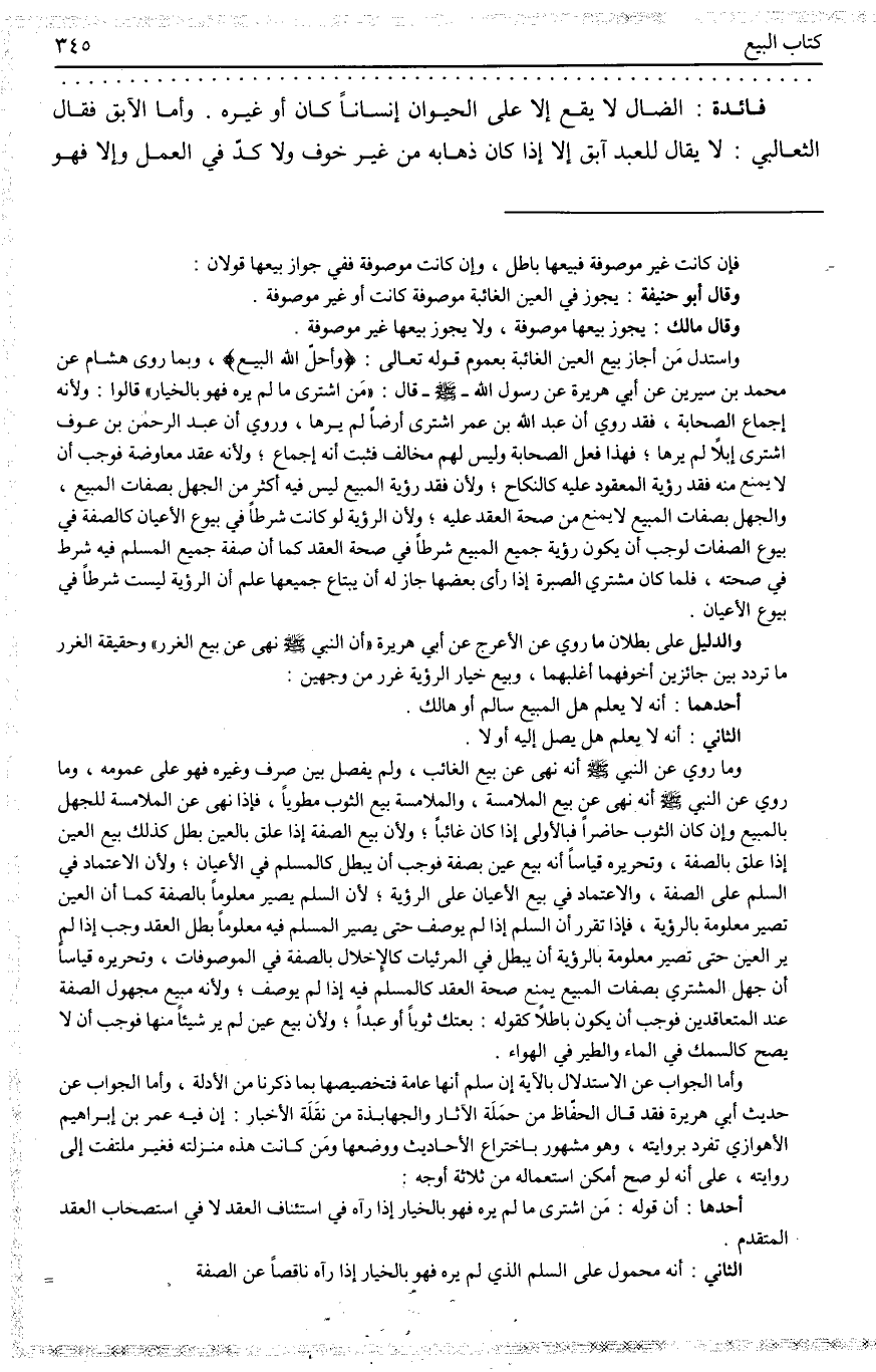 (وَلَا يَصِحُّ بَيْعُ نِصْفٍ) مَثَلًا (مُعَيَّنٍ مِنْ الْإِنَاءِ وَالسَّيْفِ وَنَحْوِهِمَا) كَثَوْبٍ نَفِيسٍ تَنْقُصُ بِقَطْعِهِ قِيمَتُهُ لِلْعَجْزِ عَنْ تَسْلِيمِ ذَلِكَ شَرْعًا؛ لِأَنَّ التَّسْلِيمَ فِيهِ لَا يُمْكِنُ إلَّا بِالْكَسْرِ أَوْ الْقَطْعِ وَفِيهِ نَقْصٌ وَتَضْيِيعُ مَالٍ وَهُوَ حَرَامٌ، وَفَرَّقُوا بَيْنَهُ وَبَيْنَ بَيْعِ مَا قَالُوهُ مِنْ صِحَّةِ بَيْعِ ذِرَاعٍ مِنْ أَرْضٍ بِأَنَّ التَّمْيِيزَ فِيهَا يَحْصُلُ بِنَصْبِ عَلَامَةٍ بَيْنَ الْمِلْكَيْنِ بِلَا ضَرَرٍ. فَإِنْ قِيلَ قَدْ تَتَضَيَّقُ مَرَافِقُ الْأَرْضِ بِالْعَلَامَةِ وَتَنْقُصُ الْقِيمَةُ فَيَنْبَغِي إلْحَاقُهَا بِالثَّوْبِ؟ . .