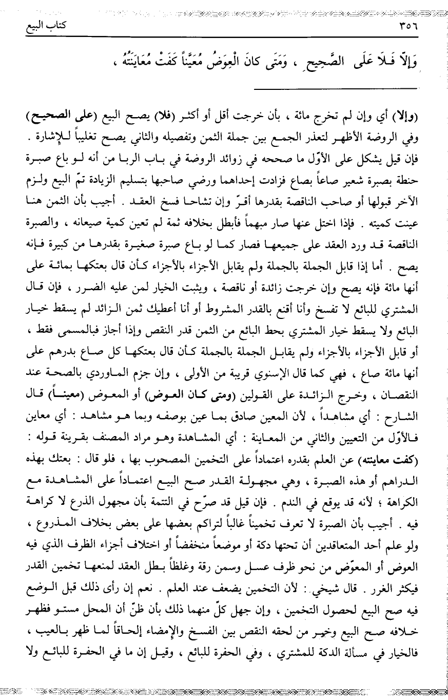 (وَتَكْفِي رُؤْيَةُ بَعْضِ الْمَبِيعِ إنْ دَلَّ عَلَى بَاقِيه كَظَاهِرِ الصُّبْرَةِ) مِنْ حِنْطَةٍ وَنَحْوِهَا وَجَوْزٍ وَنَحْوِهِ وَأَدِقَّةٍ، وَكَأَعَالِي الْمَائِعَاتِ فِي أَوْعِيَتِهَا كَالدُّهْنِ، وَأَعْلَى التَّمْرِ فِي قَوْصَرَتِهِ وَالطَّعَامِ فِي آنِيَتِهِ، وَكَذَا الْقُطْنُ الْمُجَرَّدُ عَنْ جَوْزِهِ وَلَوْ فِي عِدْلِهِ، وَلَا خِيَارَ لَهُ إذَا رَأَى الْبَاطِنَ إلَّا إذَا خَالَفَ الظَّاهِرَ بِنَقْصٍ بِخِلَافِ صُبْرَةِ الرُّمَّانِ وَالسَّفَرْجَلِ وَالْبِطِّيخِ وَنَحْوِ ذَلِكَ لِعَدَمِ الدَّلَالَةِ عَلَى بَاقِيهَا بَلْ يُشْتَرَطُ رُؤْيَةُ كُلِّ وَاحِدَةٍ مِنْهَا، حَتَّى لَوْ رَأَى أَحَدَ جَانِبَيْ الْبِطِّيخَةِ كَانَ كَبَيْعِ الْغَائِبِ، وَلَوْ كَانَ الْغَالِبُ أَنَّهَا لَا تَتَفَاوَتُ كَالثَّوْبِ الصَّفِيقِ يُرَى أَحَدُ وَجْهَيْهِ قَالَهُ الْبَغَوِيّ فِي فَتَاوِيهِ.