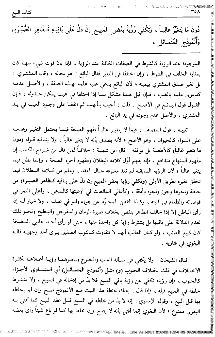 (وَتُعْتَبَرُ رُؤْيَةُ كُلِّ شَيْءٍ) غَيْرِ مَا ذُكِرَ (عَلَى مَا يَلِيقُ بِهِ) فَيُعْتَبَرُ فِي الدَّارِ رُؤْيَةُ الْبُيُوتِ وَالسُّقُوفِ وَالسُّطُوحِ وَالْجُدْرَانِ وَالْمُسْتَحَمِّ وَالْبَالُوعَةِ، وَكَذَا رُؤْيَةُ الطَّرِيقِ كَمَا فِي الْمَجْمُوعِ، وَفِي الْبُسْتَانِ رُؤْيَةُ أَشْجَارِهِ وَمَجْرَى مَائِهِ، وَكَذَا يُشْتَرَطُ رُؤْيَةُ الْمَاءِ الَّذِي تَدُورُ بِهِ الرَّحَى خِلَافًا لِابْنِ الْمُقْرِي لِاخْتِلَافِ الْغَرَضِ، وَلَا يُشْتَرَطُ رُؤْيَةُ أَسَاسِ جُدْرَانِ الْبُسْتَانِ، وَلَا رُؤْيَةُ عُرُوقِ الْأَشْجَارِ وَنَحْوِهِمَا، وَيُشْتَرَطُ رُؤْيَةُ الْأَرْضِ فِي ذَلِكَ وَنَحْوِهِ، وَلَوْ رَأَى آلَةَ بِنَاءِ الْحَمَّامِ وَأَرْضِهَا قَبْلَ بِنَائِهَا لَمْ يَكْفِ عَنْ رُؤْيَتِهَا كَمَا لَا يَكْفِي فِي التَّمْرِ رُؤْيَتُهُ رَطْبًا وَلَوْ رَأَى سَخْلَةً أَوْ ظَبْيًا فَكَمُلَا لَا يَصِحُّ بَيْعُهُمَا إلَّا بِرُؤْيَةٍ أُخْرَى، وَيُشْتَرَطُ فِي الرَّقِيقِ ذَكَرًا كَانَ أَوْ غَيْرَهُ رُؤْيَةُ مَا سِوَى الْعَوْرَةِ لَا اللِّسَانِ وَالْأَسْنَانِ، وَيُشْتَرَطُ فِي الدَّابَّةِ رُؤْيَةُ مُقْدَمِهَا وَمُؤَخَّرِهَا وَقَوَائِمِهَا وَظَهْرِهَا حَتَّى شَعْرِهَا، فَيَجِبُ رَفْعُ الْجِلِّ وَالسَّرْجِ وَالْإِكَافِ، وَلَا يُشْتَرَطُ إجْرَاؤُهَا لِيَعْرِفَ سَيْرَهَا، وَلَا يُشْتَرَطُ فِي الدَّابَّةِ رُؤْيَةُ اللِّسَانِ وَالْأَسْنَانِ، وَيُشْتَرَطُ فِي الثَّوْبِ نَشْرُهُ لِيَرَى الْجَمِيعَ، وَلَوْ لَمْ يُنْشَرْ مِثْلُهُ إلَّا عِنْدَ الْقَطْعِ، وَيُشْتَرَطُ فِي الثَّوْبِ رُؤْيَةُ وَجْهَيْ مَا يَخْتَلِفُ مِنْهُ كَأَنْ يَكُونُ صَفِيقًا كَدِيبَاجٍ مُنَقَّشٍ وَبُسُطٍ، بِخِلَافِ مَا لَا يَخْتَلِفُ وَجْهَاهُ كَكِرْبَاسٍ فَتَكْفِي رُؤْيَةُ أَحَدِهِمَا، وَيُشْتَرَطُ فِي شِرَاءِ الْمُصْحَفِ رُؤْيَةُ جَمِيعِ الْأَوْرَاقِ، وَفِي الْوَرَقِ الْبَيَاضِ رُؤْيَةُ جَمِيعِ الطَّاقَاتِ وَلَا يَصِحُّ بَيْعُ اللَّبَنِ فِي الضَّرْعِ.