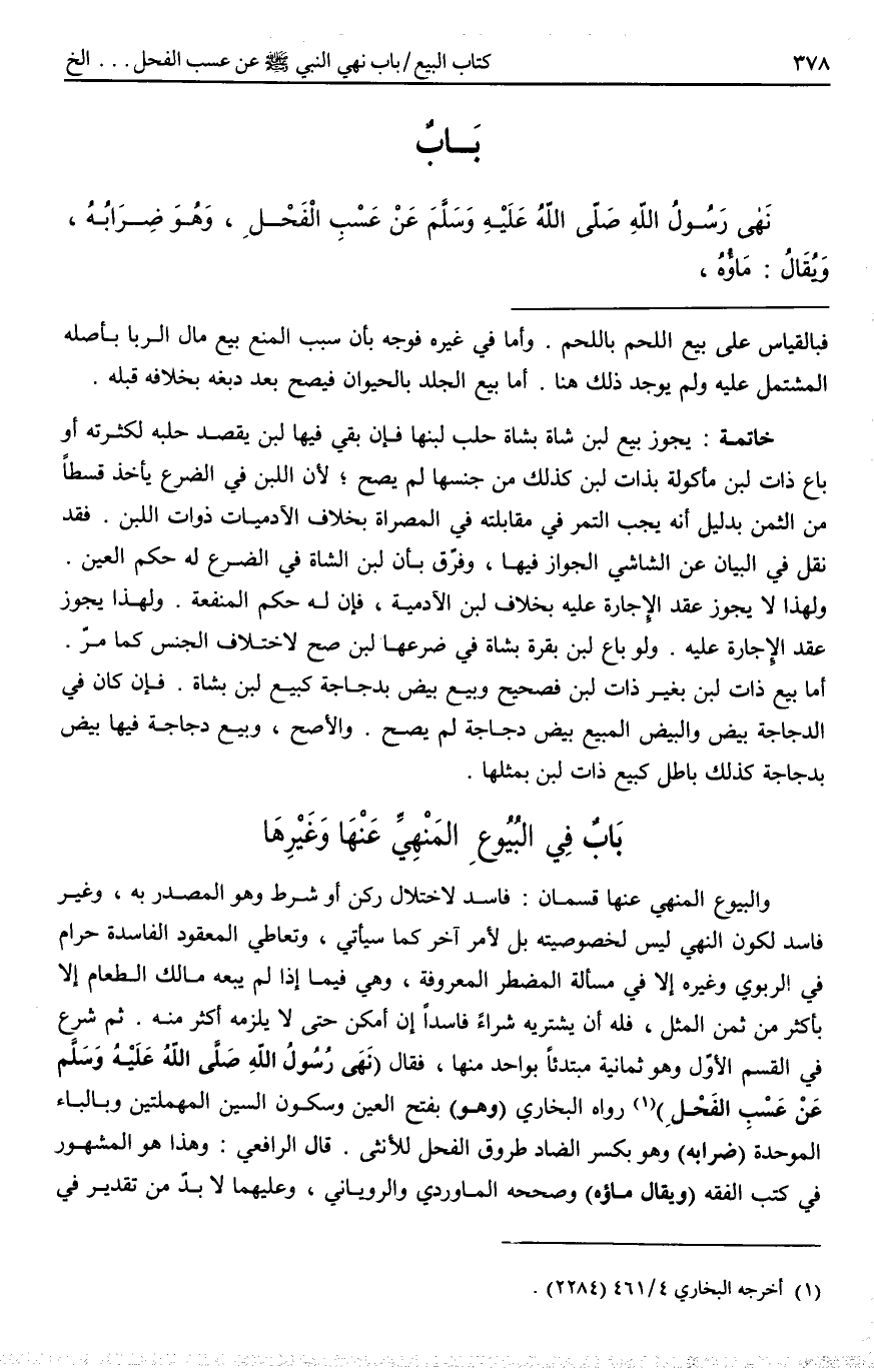 (وَ) الرَّابِعُ مِنْهَا النَّهْيُ عَنْ بَيْعِ (الْمَضَامِينِ) جَمْعُ مَضْمُونٍ كَمَجَانِينَ جَمْعُ مَجْنُونٍ أَوْ مِضْمَانٍ كَمَفَاتِيحَ جَمْعُ مِفْتَاحٍ (وَهِيَ مَا فِي أَصْلَابِ الْفُحُولِ) مِنْ الْمَاءِ. رَوَى النَّهْيَ عَنْ بَيْعِهِمَا مَالِكٌ عَنْ سَعِيدِ بْنِ الْمُسَيِّبِ مُرْسَلًا وَالْبَزَّارُ مُسْنَدًا، وَبُطْلَانُ بَيْعِهِمَا لِانْتِفَاءِ الشُّرُوطِ.