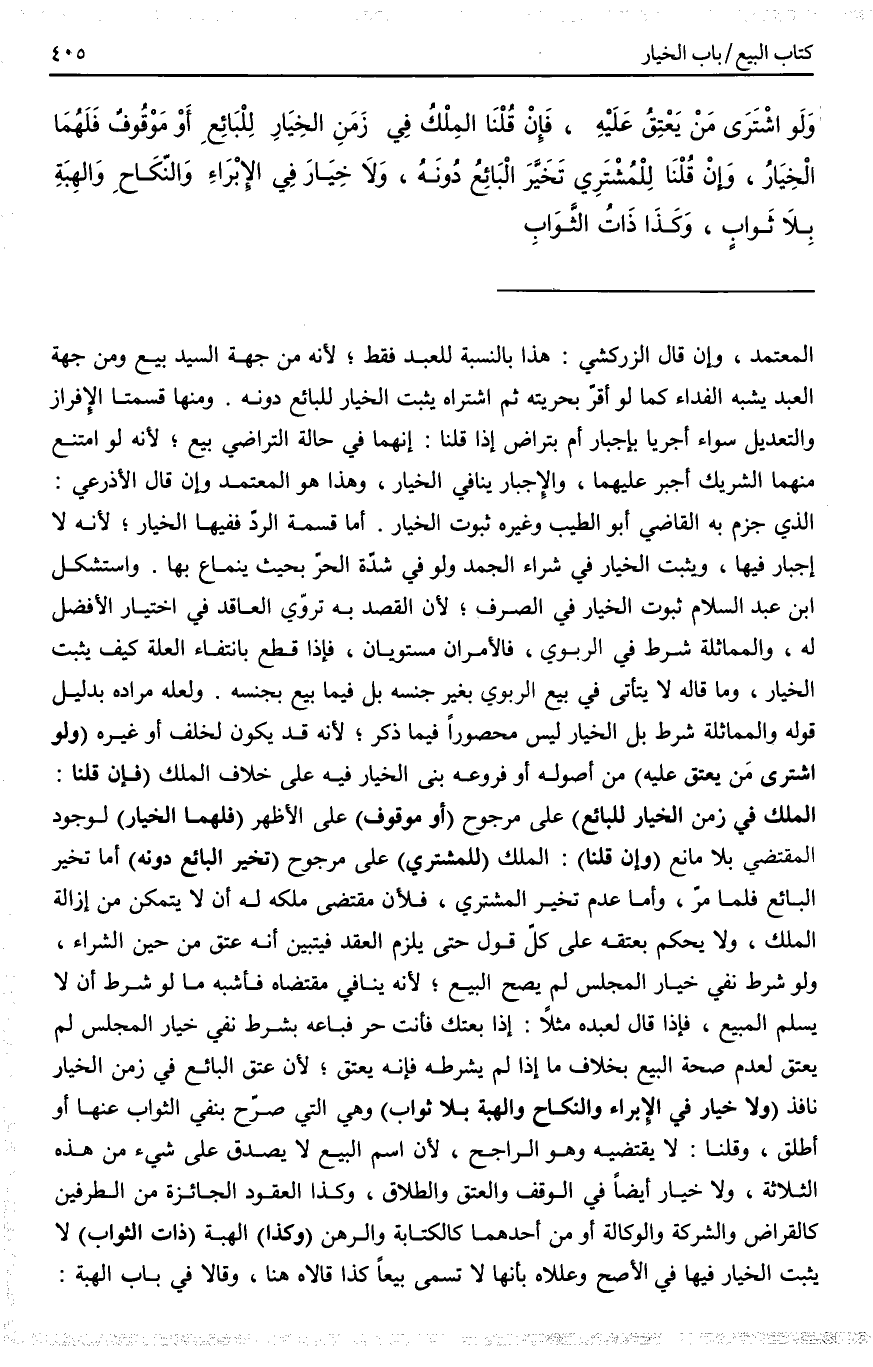 أُجِيبَ بِأَنَّ الْحِلَّ فِي الْخَبَرِ مَحْمُولٌ عَلَى الْإِبَاحَةِ الْمُسْتَوِيَةِ الطَّرَفَيْنِ، وَلَوْ حُمِلَ أَحَدُ الْعَاقِدَيْنِ فَأُخْرِجَ مِنْ الْمَجْلِسِ مُكْرَهًا بِغَيْرِ حَقٍّ لَمْ يَنْقَطِعْ خِيَارُهُ لِأَنَّهُ لَمْ يَفْعَلْ شَيْئًا وَكَذَا لَا يَنْقَطِعُ خِيَارُهُ وَإِذَا أُكْرِهَ عَلَى الْخُرُوجِ، وَلَوْ لَمْ يَسُدَّ فَمَهُ؛ لِأَنَّ فِعْلَ الْمُكْرَهِ كَلَا فِعْلٍ وَالسُّكُوتَ عَنْ الْفَسْخِ لَا يَقْطَعُ الْخِيَارَ كَمَا فِي الْمَجْلِسِ. فَإِنْ قِيلَ: قَدْ مَرَّ أَنَّ النَّاسِيَ وَالْجَاهِلَ يَنْقَطِعُ خِيَارُهُمَا مَعَ تَسْوِيَتِهِمَا لِلْمُكْرَهِ فِي أَبْوَابٍ كَثِيرَةٍ.