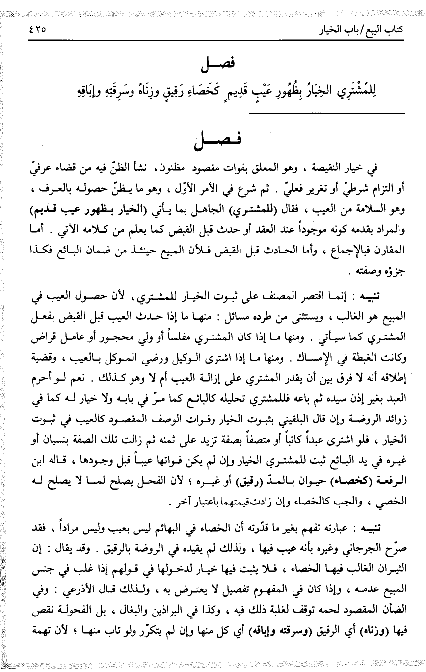 أُجِيبَ بِأَنَّ صُورَتَهُ أَنْ يَبِيعَهُ ثُمَّ يَجْنِي جِنَايَةً تَتَعَلَّقُ بِرَقَبَتِهِ قَبْلَ قَبْضِهِ فَإِنَّهَا مِنْ ضَمَانِ الْبَائِعِ، أَوْ لَهُ أُصْبُعٌ زَائِدَةٌ، أَوْ سِنٌّ شَاغِيَةٌ، وَهِيَ بِشِينٍ وَغَيْنٍ مُعْجَمَتَيْنِ، الزَّائِدَةُ الَّتِي تُخَالِفُ نَبْتَتُهَا نَبْتَةَ بَقِيَّةِ الْأَسْنَانِ، أَوْ سِنٌّ مَقْلُوعَةٌ لَا لِكِبَرٍ، أَوْ بِهِ قُرُوحٌ أَوْ أَبْهَقَ، وَالْبَهَقُ بَيَاضٌ يَعْتَرِي الْجِلْدَ يُخَالِفُ لَوْنَهُ وَلَيْسَ مِنْ الْبَرَصِ، فَالْبَرَصُ وَالْجُذَامُ أَوْلَى، أَوْ أَبْيَضَ الشَّعْرِ فِي غَيْرِ سِنِّهِ، وَلَا تَضُرُّ حُمْرَتُهُ، أَوْ مُخَبَّلًا بِالْمُوَحَّدَةِ، وَهُوَ مَنْ فِي عَقْلِهِ خَبَلٌ أَوْ فَسَادٌ، أَوْ أَبْلَهَ، وَهُوَ مَنْ غَلَبَ عَلَيْهِ سَلَامَةُ الصَّدْرِ. رُوِيَ " إنَّ أَكْثَرَ أَهْلِ الْجَنَّةِ الْبُلْهُ " أَيْ فِي أَمْرِ الدُّنْيَا لِقِلَّةِ اهْتِمَامِهِمْ بِهَا، وَهُمْ أَكْيَاسٌ فِي أَمْرِ الْآخِرَةِ، وَحَمَلَ بَعْضُهُمْ الْأَبْلَهَ عَلَى مَعْنًى لَطِيفٍ، وَهُوَ مَنْ يَعْمَلُ لِأَجْلِ النَّعِيمِ، وَغَيْرُهُ هُوَ الَّذِي يَعْمَلُ لِوَجْهِ اللَّهِ تَعَالَى، فَأَكْثَرُ أَهْلِ الْجَنَّةِ مِنْ الْقِسْمِ الْأَوَّلِ فَهُوَ لَيْسَ بِمَذْمُومٍ، وَلَكِنَّ الْقِسْمَ الثَّانِي أَعْلَى (وَجِمَاحُ الدَّابَّةِ) بِالْكَسْرِ: أَيْ امْتِنَاعُهَا عَلَى رَاكِبِهَا (وَعَضُّهَا) أَوْ رَمْحُهَا لِنَقْصِ الْقِيمَةِ بِذَلِكَ، وَكَوْنُهَا تَشْرَبُ لَبَنَهَا أَوْ لَبَنَ غَيْرِهَا، أَوْ تَكُونُ بِحَيْثُ يُخْشَى مِنْ رُكُوبِهَا السُّقُوطُ لِخُشُونَةِ مَشْيِهَا، أَوْ سَاقِطَةُ الْأَسْنَانِ لَا لِكِبَرٍ أَوْ قَلِيلَةُ الْأَكْلِ بِخِلَافِ قِلَّةِ الْأَكْلِ فِي الْآدَمِيِّ، وَالْحُمُوضَةُ فِي الْبِطِّيخِ لَا الرُّمَّانِ عَيْبٌ، وَلَا رَدَّ بِكَوْنِ الرَّقِيقِ رَطْبَ الْكَلَامِ وَلَا