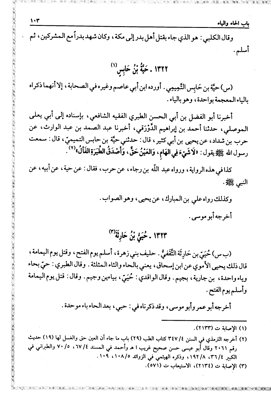 س: حية بْن حابس التميمي أورده ابن أَبِي عاصم وغيره في الصحابة، إلا أنهما ذكراه بالباء المعجمة بواحدة، وهو بالياء.