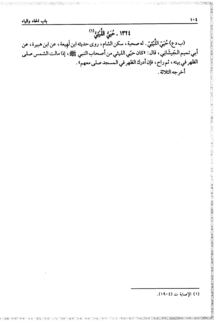 ب د ع: حيي الليثي له صحبة، سكن الشام، روى حديثه ابن لهيعة، عن ابن هبيرة، عن أَبِي تميم الجيشاني، قال: كان حيي الليثي من أصحاب النَّبِيّ صَلَّى اللَّهُ عَلَيْهِ وَسَلَّمَ إذا مالت الشمس صلى الظهر في بيته، ثم راح، فإن أدرك الظهر في المسجد صلى معهم.