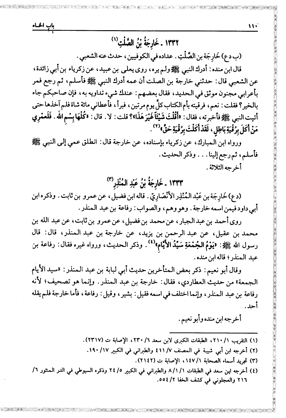 وقال أَبُو نعيم: ذكر بعض المتأخرين حديث أَبِي لبابة بْن عبد المنذر: " سيد الأيام الجمعة " من حديث العطاردي، فقال: خارجة بْن عبد المنذر.