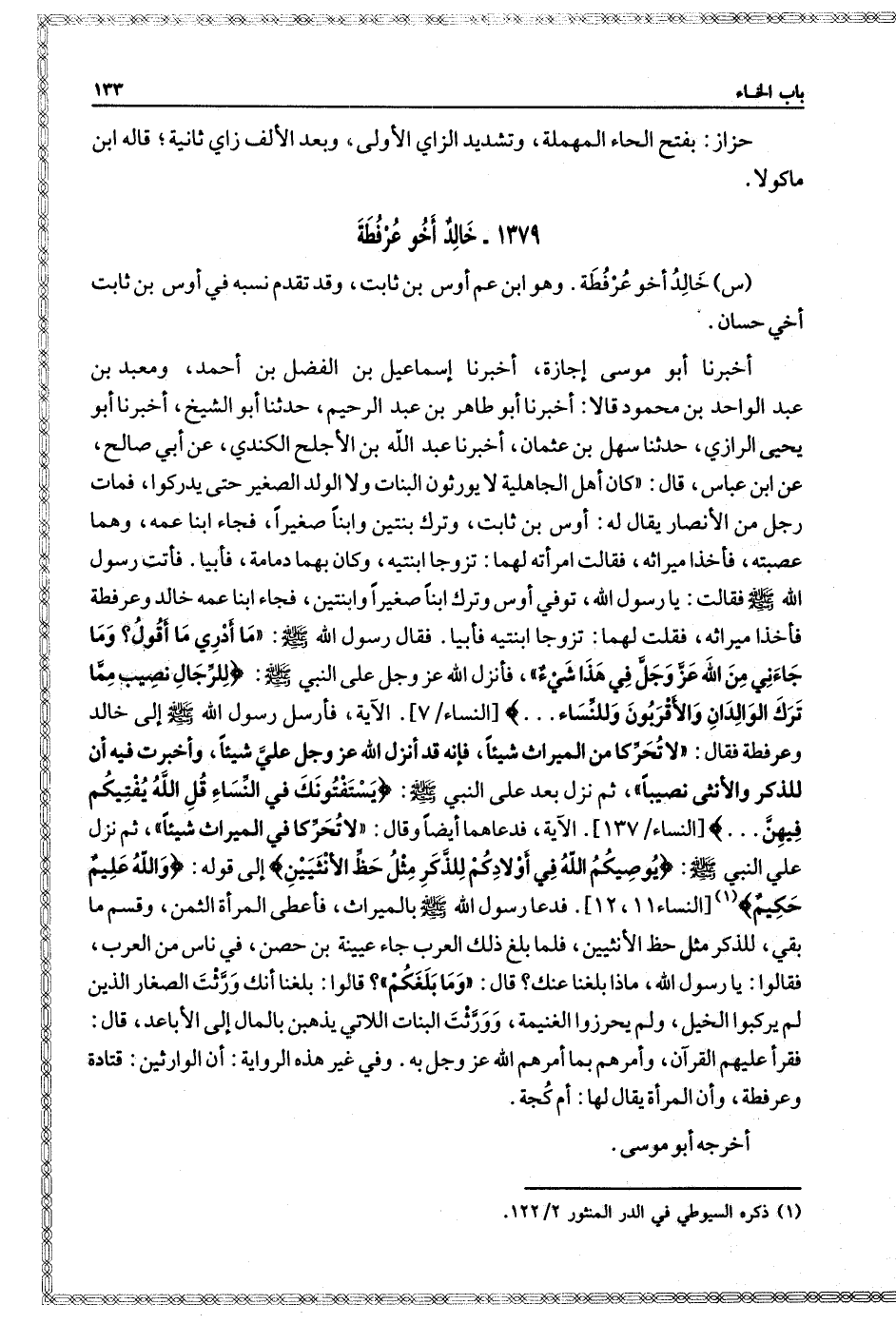 فَأَرْسَلَ رَسُولُ اللَّهِ صَلَّى اللَّهُ عَلَيْهِ وَسَلَّمَ إِلَى خَالِدٍ وَعُرْفُطَةَ، فَقَالَ: " لا تُحَرِّكَا مِنَ الْمِيرَاثِ شَيْئًا، فَإِنَّهُ قَدْ أَنْزَلَ اللَّهُ عَزَّ وَجَلَّ عَلَيَّ شَيْئًا، وَأُخْبِرْتُ فِيهِ أَنَّ لِلذَّكِرِ وَالأُنْثَى نَصِيبًا "، ثُمَّ نَزَلَ بَعْدُ عَلَى النَّبِيِّ صَلَّى اللَّهُ عَلَيْهِ وَسَلَّمَ: {يَسْتَفْتُونَكَ فِي النِّسَاءِ قُلِ اللَّهُ يُفْتِيكُمْ فِيهِنَّ} .