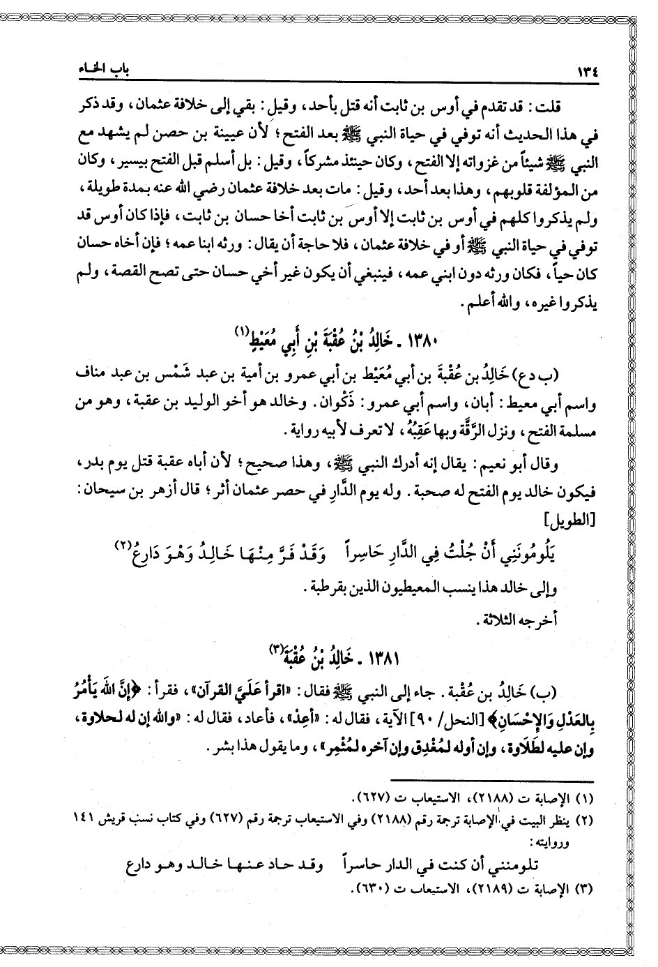 ب: خَالِد بْن عقبة جاء إِلَى النَّبِيّ صَلَّى اللَّهُ عَلَيْهِ وَسَلَّمَ فقال: اقرأ علي القرآن، فقرأ: {إِنَّ اللَّهَ يَأْمُرُ بِالْعَدْلِ وَالإِحْسَانِ} الآية، فقال له: أعد، فأعاد، فقال له: والله إن له لحلاوة، وَإِن عليه لطلاوة، وَإِن أوله لمغدق وغن آخره لمثمر، وما يقول هذا بشر.