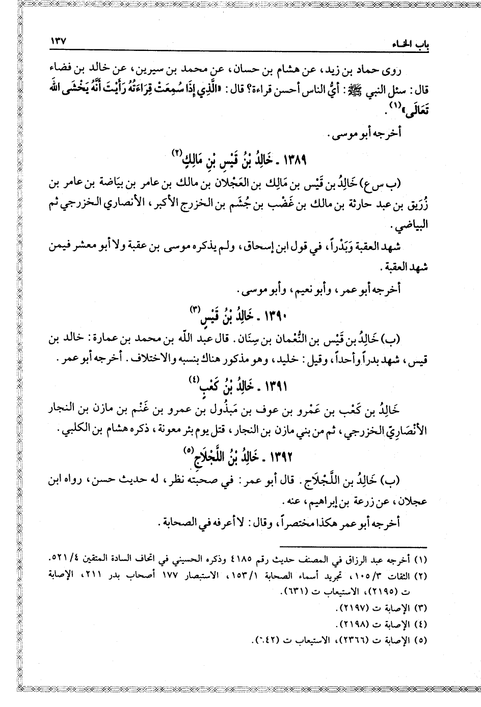 ب: خَالِد بْن قيس بْن النعمان بْن سنان قال عَبْد اللَّهِ بْن مُحَمَّدِ بْنِ عمارة: خَالِد بْن قيس، شهد بدرًا وأحدًا، وقيل: خليد، وهو مذكور هناك بنسبه والاختلاف.