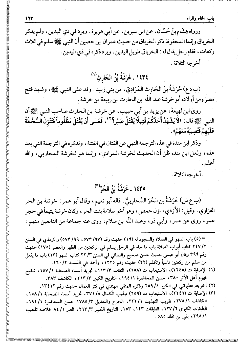 وقال أَبُو موسى: جمع أَبُو عَبْد اللَّهِ بينهما، والظاهر أنهما اثنان، وأما أَبُو عمر فلم يذكر من روى حديث الفتنة عن خرشة، بل ذكر الراوي عن خرشة في الترجمة التي بعد هذه، وجعلها ترجمة ثالثة، ويرد الكلام عليها فيها، إن شاء اللَّه تعالى.