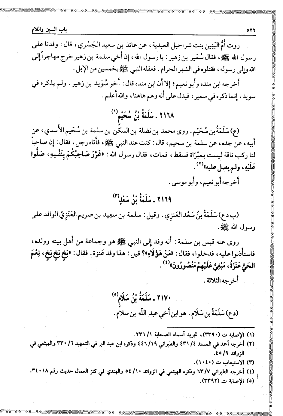 ع: سلمة بْن سحيم روى مُحَمَّد بْن نضلة بْن السكن بْن سلمة بْن سحيم الأسدي، عن أبيه، عن جده، عن سلمة بْن سحيم، قال: كنت عند النَّبِيّ صَلَّى اللَّهُ عَلَيْهِ وَسَلَّمَ فأتاه رجل، فقال: إن صاحبًا لنا ركب ناقة ليست بمبرأة فسقط، فمات، فقال رَسُول اللَّهِ: " غرر صاحبكم بنفسه، صلوا عليه "، ولم يصل عليه.