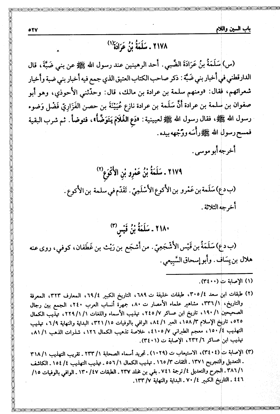 س: سلمة بْن عرادة الضبي أحد الرهينين عند رَسُول اللَّهِ صَلَّى اللَّهُ عَلَيْهِ وَسَلَّمَ عن بني ضبة، قال الدارقطني في أخبار بني ضبة: ذكر صاحب الكتاب العتيق الذي جمع فيه أخبار بني ضبة وأخبار شعرائهم، فقال، ومنهم: سلمة بْن عرادة بْن مالك، قال: وحدثني الأحوذي، وهو أَبُو صفوان بْن سلمة بْن عرادة، أن سلمة بْن عرادة نازع عيينة بْن حصن الفزاري، فضل وضوء رَسُول اللَّهِ صَلَّى اللَّهُ عَلَيْهِ وَسَلَّمَ فقال رَسُول اللَّهِ صَلَّى اللَّهُ عَلَيْهِ وَسَلَّمَ لعيينة: " دع الغلام يتوضأ "، فتوضأ، ثم شرب البقية، فمسح رَسُول اللَّهِ صَلَّى اللَّهُ عَلَيْهِ وَسَلَّمَ رأسه، ووجهه بيده.