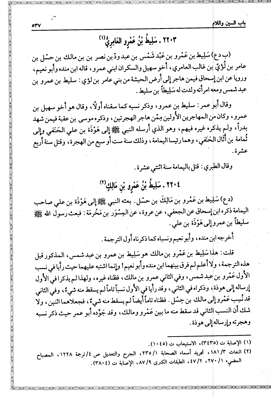 قلت: هذا سليط بْن عمرو بْن مالك، هو سليط بْن عمرو بْن عبد شمس، المذكور قبل هذه الترجمة، ولا أعلم لم فرق بينهما ابن منده، وَأَبُو نعيم، وَإِنما اشتبه عليهما حيث رأيا في نسب الأول عمرو بْن عبد شمس، وفي الثاني عمرو بْن مالك، فظناه غيره، ولهذا لم يذكرا في الأول إرساله إِلَى هوذة، وذكراه في الثاني، وقد رأيا في الأول نسبًا تامًا لم يسقط منه شيء، وفي الثاني قد نسب عمرو إِلَى مالك بْن حسل.