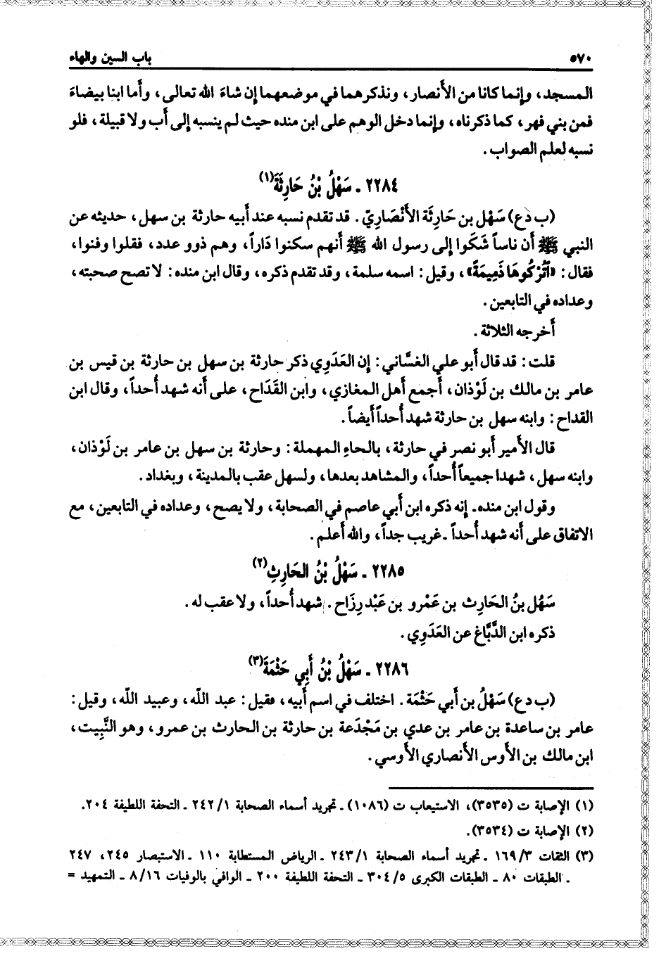 وقال الأمير أَبُو نصر في حارثة، بالحاء المهملة: وحارثة بْن سهل بْن عامر بْن لوذان، وابنه سهل، شهدا جميعًا أحدًا، والمشاهد، بعدها.