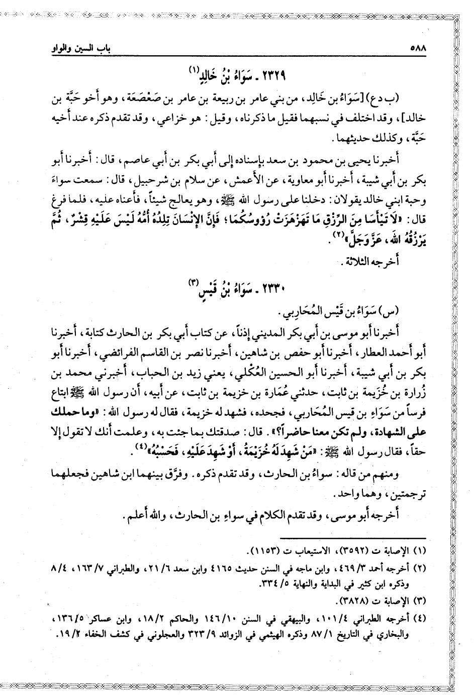 (٥٩٤) أخبرنا أَبُو مُوسَى بْنُ أَبِي بَكْرٍ الْمَدِينِيُّ إِذْنًا، عن كِتَابِ أَبِي بَكْرِ بْنِ الْحَارِثِ كِتَابَةً، أخبرنا أَبُو أَحْمَدَ الْعَطَّارُ، أخبرنا أَبُو حَفْصِ بْنُ شَاهِينَ، أخبرنا نَصْرُ بْنُ الْقَاسِمِ الْفَرَائِضِيُّ، أخبرنا أَبُو بَكْرِ بْنُ أَبِي شَيْبَةَ، أخبرنا أَبُو الْحُسَيْنِ الْعُكْلِيُّ، يَعْنِي زَيْدَ بْنَ الْحُبَابِ، أَخْبَرَنِي مُحَمَّدُ بْنُ زُرَارَةَ بْنِ خُزَيْمَةَ بْنِ ثَابِتٍ، حَدَّثَنِي عُمَارَةُ بْنُ خُزَيْمَةَ بْنِ ثَابِتٍ، عن أَبِيهِ، أَنَّ رَسُول اللَّهِ صَلَّى اللَّهُ عَلَيْهِ وَسَلَّمَ ابْتَاعَ فَرَسًا مِنْ سَوَاءِ بْنِ قَيْسٍ الْمُحَارِبِيِّ، فَجَحَدَهُ، فَشَهِدَ لَهُ خُزَيْمَةُ، فَقَالَ لَهُ رَسُول اللَّهِ صَلَّى اللَّهُ عَلَيْهِ وَسَلَّمَ: " وَمَا حَمَلَكَ عَلَى الشَّهَادَةِ، وَلَمْ تَكُنْ مَعَنَا حَاضِرًا؟ " قَالَ: صَدَّقْتُكَ بِمَا جِئْتَ بِهِ، وَعَلِمْتُ أَنَّكَ لا تَقُولُ إِلا حَقًّا، فَقَالَ رَسُول اللَّهِ صَلَّى اللَّهُ عَلَيْهِ وَسَلَّمَ: " مَنْ شَهِدَ لَهُ خُزَيْمَةُ، أَوْ شَهِدَ عَلَيْهِ، فَحَسْبُهُ " ومنهم من قاله: سواء بْن الحارث، وقد تقدم ذكره، وفرق بينهما ابن شاهين، فجعلهما ترجمتين، وهما واحد.