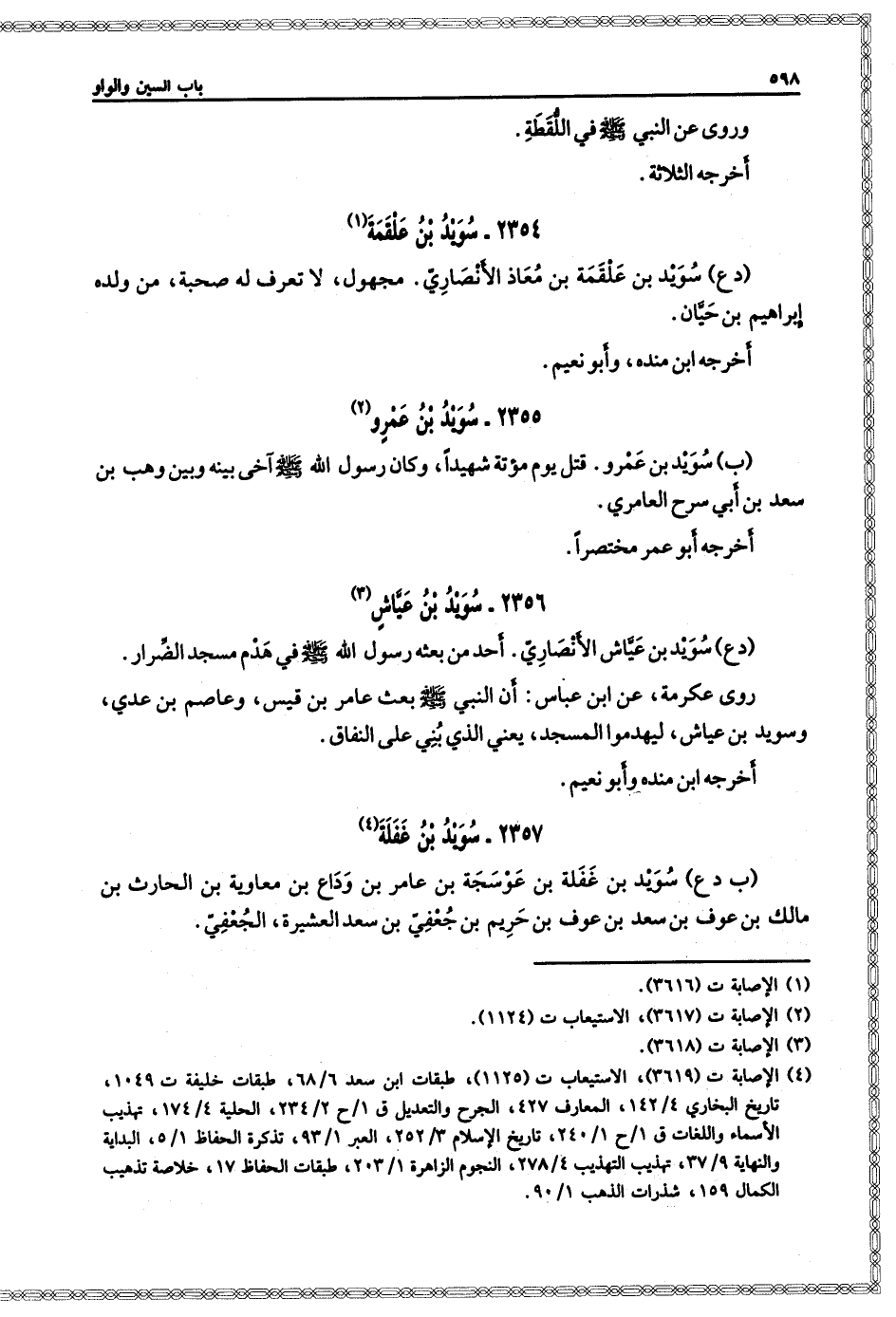 ب: سويد بْن عمرو قتل يَوْم مؤتة شهيدًا، وكان رَسُول اللَّهِ صَلَّى اللَّهُ عَلَيْهِ وَسَلَّمَ آخى بينه وبين وهب بْن سعد بْن أَبِي سرح العامري.
