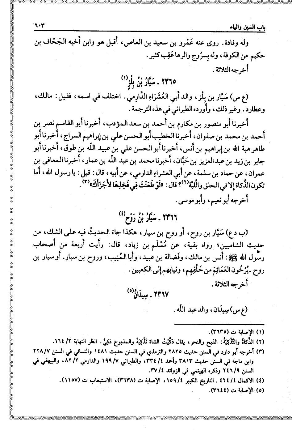 ب د ع: سيار بْن روح أو روح بْن سيار هكذا جاء الحديث فيه عَلَى الشك، من حديث الشاميين، رواه بقية، عن مسلم بْن زياد، قال: رأيت أربعة من أصحاب رَسُول اللَّهِ صَلَّى اللَّهُ عَلَيْهِ وَسَلَّمَ: أنس بْن مالك، وفضالة بْن عبيد، وأبا المنيب، وروح بْن سيار، أو سيار بْن روح، يرخون العمائم من خلفهم، وثيابهم إِلَى الكعبين.