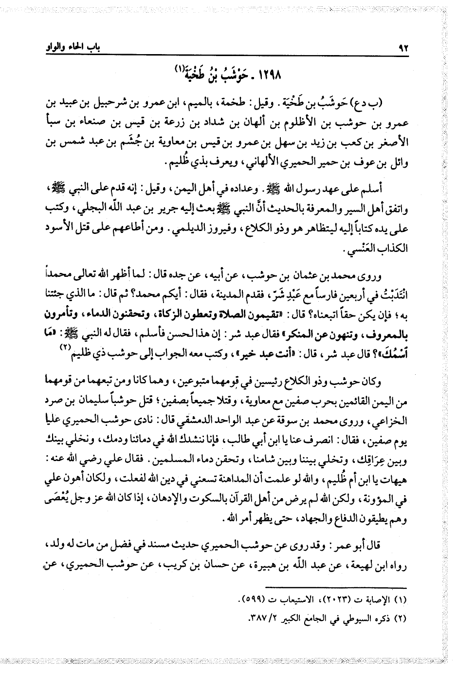 وروى مُحَمَّد بْن عثمان بْن حوشب، عن أبيه، عن جده، قال: لما أظهر اللَّه تعالى محمدًا انتدبت في أربعين فارسًا مع عبد شر، فقدم المدينة، فقال: أيكم مُحَمَّد؟ ثم قال: ما الذي جئتنا به، فإن يكن حقًا اتبعناه؟ قال: " تقيمون الصلاة، وتعطون الزكاة، وتحقنون الدماء، وتأمرون بالمعروف، وتنهون عن المنكر "، فقال عبد شر: إن هذا لحسن فأسلم، فقال له النَّبِيّ صَلَّى اللَّهُ عَلَيْهِ وَسَلَّمَ: " ما اسمك؟ " قال: عبد شر، قال: " أنت عبد خير "، وكتب معه الجواب إِلَى حوشب ذي ظليم وكان حوشب وذو الكلاع رئيسين في قومهما متبوعين، وهما حنظلة بن أبي عامر الأنصاري ركانا ومن تبعهما من قومهما من اليمن بحرب صفين مع معاوية، وقتلا جميعًا بصفين، قتل حوشبًا سليمان بْن صرد الخزاعي.