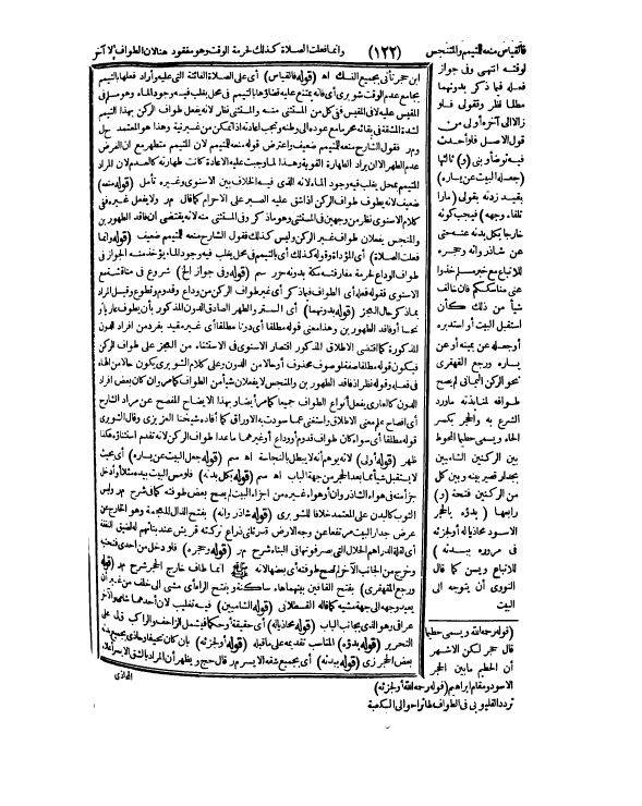 (قَوْلُهُ: وَرَجَعَ الْقَهْقَرَى) بِفَتْحِ الْقَافَيْنِ بَيْنَهُمَا هَاءٌ سَاكِنَةٌ وَبِفَتْحِ الرَّاءِ أَيْ: مَشَى إلَى خَلْفٍ مِنْ غَيْرِ أَنْ يُعِيدَ وَجْهَهُ إلَى جِهَةِ مَشْيِهِ كَمَا قَالَهُ الْقَسْطَلَّانِيُّ. (قَوْلُهُ: الشَّامِيَّيْنِ) فِيهِ تَغْلِيبٌ؛ لِأَنَّ أَحَدَهُمَا شَامِيٌّ وَالْآخَرَ عِرَاقِيٌّ وَهُوَ الَّذِي بِجَانِبِ الْبَابِ. (قَوْلُهُ: مُحَاذِيًا لَهُ) أَيْ حَقِيقَةً، أَوْ حُكْمًا فَيَشْمَلُ الزَّاحِفَ وَالرَّاكِبَ ق ل عَلَى التَّحْرِيرِ. (قَوْلُهُ: بَدْؤُهُ) الْمُنَاسِبُ تَقْدِيمُهُ عَلَى مَا قَبْلَهُ. (قَوْلُهُ: أَوْ لِجُزْئِهِ) بِأَنْ كَانَ نَحِيفًا وَحَاذَى بِجَمِيعِ بَدَنِهِ بَعْضَ الْحَجَرِ ز ي. (قَوْلُهُ: بِبَدَنِهِ) أَيْ: بِجَمِيعِ شِقِّهِ الْأَيْسَرِ م ر قَالَ حَجّ: وَيَظْهَرُ أَنَّ الْمُرَادَ بِالشِّقِّ الْأَيْسَرِ أَعْلَاهُ