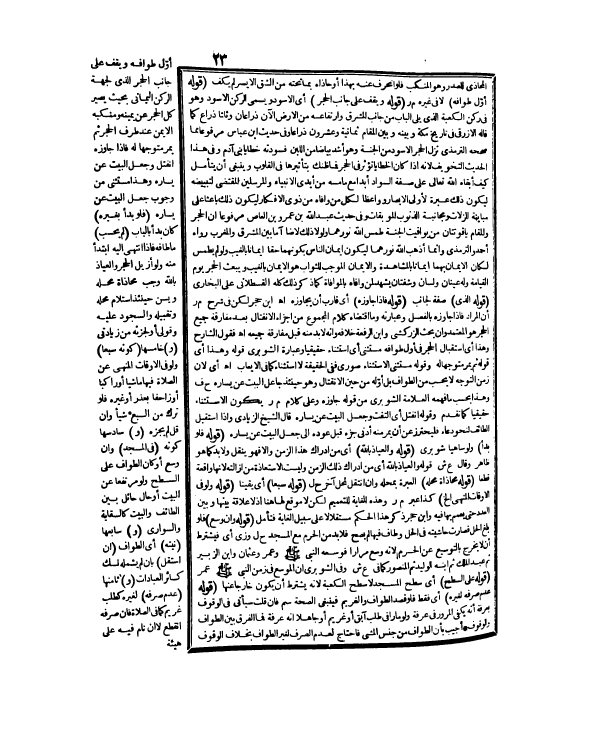 ـــــــــــــــــــــــــــــQالْمُحَاذِي لِلصَّدْرِ وَهُوَ الْمَنْكِبُ فَلَوْ انْحَرَفَ عَنْهُ بِهَذَا، أَوْ حَاذَاهُ بِمَا تَحْتَهُ مِنْ الشِّقِّ الْأَيْسَرِ لَمْ يَكْفِ. (قَوْلُهُ: أَوَّلَ طَوَافِهِ) لَا فِي غَيْرِهِ م ر. (قَوْلُهُ: وَيَقِفُ عَلَى جَانِبِ الْحَجَرِ) أَيْ: الْأَسْوَدِ وَيُسَمَّى الرُّكْنَ الْأَسْوَدَ وَهُوَ فِي رُكْنِ الْكَعْبَةِ الَّذِي يَلِي الْبَابَ مِنْ جَانِبِ الْمَشْرِقِ وَارْتِفَاعُهُ مِنْ الْأَرْضِ الْآنَ ذِرَاعَانِ وَثُلُثَا ذِرَاعٍ كَمَا قَالَهُ الْأَزْرَقِيُّ فِي تَارِيخِ مَكَّةَ وَبَيْنَهُ وَبَيْنَ الْمَقَامِ ثَمَانِيَةٌ وَعِشْرُونَ ذِرَاعًا، وَفِي حَدِيثِ ابْنِ عَبَّاسٍ مَرْفُوعًا مِمَّا صَحَّحَهُ التِّرْمِذِيُّ «نَزَلَ الْحَجَرُ الْأَسْوَدُ مِنْ الْجَنَّةِ وَهُوَ أَشَدُّ بَيَاضًا مِنْ اللَّبَنِ فَسَوَّدَتْهُ خَطَايَا بَنِي آدَمَ» .