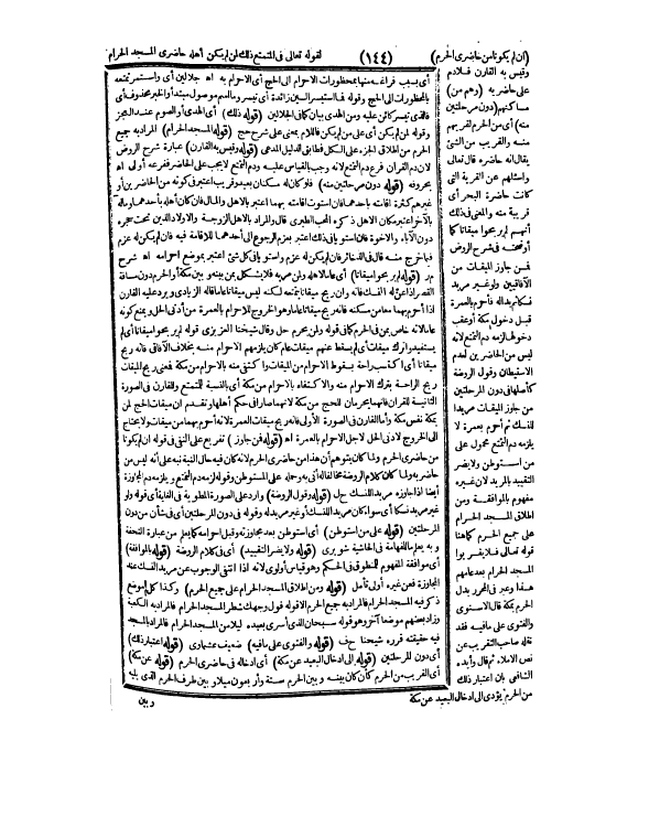 (قَوْلُهُ: وَمِنْ إطْلَاقِ الْمَسْجِدِ الْحَرَامِ عَلَى جَمِيعِ الْحَرَمِ) وَكَذَا كُلُّ مَوْضِعٍ ذُكِرَ فِيهِ الْمَسْجِدُ الْحَرَامُ فَالْمُرَادُ بِهِ جَمِيعُ الْحَرَمِ إلَّا قَوْلَهُ {فَوَلِّ وَجْهَكَ شَطْرَ الْمَسْجِدِ الْحَرَامِ} [البقرة: 144] فَالْمُرَادُ بِهِ الْكَعْبَةُ وَزَادَ بَعْضُهُمْ مَوْضِعًا آخَرَ وَهُوَ قَوْلُهُ: {سُبْحَانَ الَّذِي أَسْرَى بِعَبْدِهِ لَيْلا مِنَ الْمَسْجِدِ الْحَرَامِ} [الإسراء: 1] فَالْمُرَادُ بِالْمَسْجِدِ فِيهِ حَقِيقَتُهُ قَرَّرَهُ شَيْخُنَا ح ف. (قَوْلُهُ: وَالْفَتْوَى عَلَى مَا فِيهِ) ضَعِيفٌ عَشْمَاوِيٌّ (قَوْلُهُ: اعْتِبَارَ ذَلِكَ) أَيْ: دُونَ الْمَرْحَلَتَيْنِ. (قَوْلُهُ: إلَى إدْخَالِ الْبَعِيدِ عَنْ مَكَّةَ) أَيْ: إدْخَالِهِ فِي حَاضِرِي الْحَرَمِ (قَوْلُهُ: عَنْ مَكَّةَ) أَيْ: الْقَرِيبِ مِنْ الْحَرَمِ كَأَنْ كَانَ بَيْنَهُ وَبَيْنَ الْحَرَمِ سِتَّةٌ وَأَرْبَعُونَ مِيلًا وَبَيْنَ طَرَفِ الْحَرَمِ الَّذِي يَلِيهِ