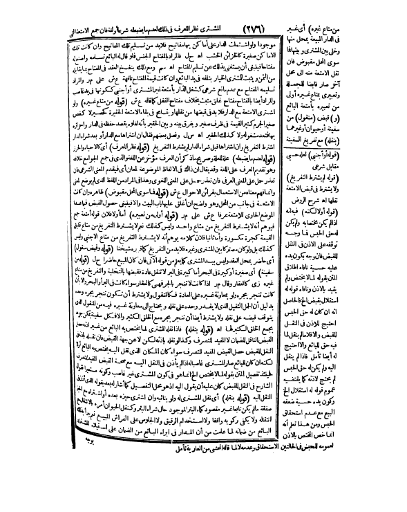 ـــــــــــــــــــــــــــــQمَوْجُودًا وَلَوْ اشْتَمَلَتْ الدَّارُ عَلَى أَمَاكِنَ بِهَا مَفَاتِيحُ فَلَا بُدَّ مِنْ تَسْلِيمِ تِلْكَ الْمَفَاتِيحِ، وَإِنْ كَانَتْ تِلْكَ الْأَمَاكِنُ صَغِيرَةً كَالْخَزَائِنِ الْخَشَبِ. اهـ. ح ل فَالْمُرَادُ بِالْمِفْتَاحِ الْجِنْسُ فَلَوْ قَالَ لَهُ الْبَائِعُ تَسَلَّمْهُ وَاصْنَعْ لَهُ مِفْتَاحًا فَيَنْبَغِي أَنْ يَسْتَغْنِيَ بِذَلِكَ عَنْ تَسْلِيمِ الْمِفْتَاحِ. اهـ. سم وَمَعَ ذَلِكَ يَنْفَسِخُ الْعَقْدُ فِي الْمِفْتَاحِ، بِمَا يُقَابِلُهُ مِنْ الثَّمَنِ وَيَثْبُتُ لِلْمُشْتَرِي الْخِيَارُ بِتَلَفِهِ فِي يَدِ الْبَائِعِ، وَإِنْ كَانَتْ قِيمَةُ الْمِفْتَاحِ تَافِهَةً ع ش عَلَى م ر وَالْمُرَادُ تَسْلِيمُهُ الْمِفْتَاحَ مَعَ عَدَمِ مَانِعٍ شَرْعِيٍّ كَشَغْلِ الدَّارِ بِأَمْتِعَةِ غَيْرِ الْمُشْتَرِي أَوْ أَجْنَبِيٍّ كَكَوْنِهَا فِي يَدِ غَاصِبٍ وَالْمُرَادُ أَيْضًا بِالْمِفْتَاحِ مِفْتَاحُ غَلْقٍ مُثْبَتٍ بِخِلَافِ مِفْتَاحِ الْقُفْلِ كَمَا قَالَهُ ع ش (قَوْلُهُ مِنْ مَتَاعِ غَيْرِهِ) وَلَوْ اشْتَرَى الْأَمْتِعَةَ مَعَ الدَّارِ فَلَا بُدَّ فِي قَبْضِهَا مِنْ نَقْلِهَا وَيُتَسَامَحُ فِي بَقَاءِ الْأَمْتِعَةِ الْحَقِيرَةِ كَحَصِيرٍ لَا كَفَصٍّ صَغِيرِ الْجِرْمِ كَثِيرِ الْقِيمَةِ فِي ظَرْفٍ صَغِيرٍ وَيُفَرَّقُ بَيْنَهُ وَبَيْنَ الْحَقِيرِ بِأَنَّهُ لِغُلُوِّهِ يُقْصَدُ حِفْظُهُ فِي الدَّارِ وَإِحْرَازُهُ بِهَا فَتُعَدُّ مَشْغُولَةً وَلَا كَذَلِكَ الْحَقِيرُ. اهـ. س ل وَفَصَّلَ بَعْضُهُمْ فَقَالَ: إنْ اشْتَرَاهَا مَعَ الدَّارِ أَوْ بَعْدَ شِرَاءِ الدَّارِ اُشْتُرِطَ التَّفْرِيغُ وَإِنْ اشْتَرَاهَا قَبْلَ شِرَاءِ الدَّارِ لَمْ يُشْتَرَطْ التَّفْرِيغُ. (قَوْلُهُ نَظَرًا لِلْعُرْفِ) أَيْ كَالْإِحْيَاءِ وَالْحِرْزِ (قَوْلُهُ لِعَدَمِ مَا يَضْبِطُهُ) عِلَّةٌ لِلْعِلَّةِ وَصَرِيحُ مَا ذُكِرَ أَنَّ الْعُرْفَ مُؤَخَّرٌ عَنْ اللُّغَةِ وَاَلَّذِي فِي جَمْعِ الْجَوَامِعِ خِلَافُهُ وَهُوَ تَقْدِيمُ الْعُرْفِ عَلَى اللُّغَةِ وَقَدْ يُقَالُ: إنَّ ذَاكَ فِي الْأَلْفَاظِ الْمَوْضُوعَةِ لِمَعَانٍ أَيْ فَيُقَدَّمُ الْمَعْنَى الشَّرْعِيُّ فَإِنْ تَعَذَّرَ حُمِلَ عَلَى الْمَعْنَى الْعُرْفِيِّ فَإِنْ تَعَذَّرَ حُمِلَ عَلَى الْمَعْنَى اللُّغَوِيِّ وَهَذَا فِي الْمُرَادِ مِنْ اللَّفْظِ الَّذِي لَمْ يُوضَعْ لِمَعْنًى وَإِنَّمَا فُهِمَ مَعْنَاهُ مِنْ الِاسْتِعْمَالِ بِقَرَائِنِ الْأَحْوَالِ ع ش. (قَوْلُهُ فَمَا سِوَى الْمَحَلِّ مَقْبُوضٌ) ظَاهِرُهُ وَإِنْ كَانَتْ الْأَمْتِعَةُ فِي جَانِبٍ مِنْ الْمَحَلِّ وَهُوَ وَاضِحٌ إنْ أُغْلِقَ عَلَيْهَا بَابُ الْبَيْتِ وَإِلَّا فَيَنْبَغِي حُصُولُ الْقَبْضِ فِيمَا عَدَا الْمَوْضِعَ الْحَاوِيَ لِلْأَمْتِعَةِ عُرْفًا ع ش عَلَى م ر (قَوْلُهُ أَوْلَى مِنْ تَعْبِيرِهِ) أَمَّا أَوَّلًا فَلِأَنَّ قَوْلَهُ أَمْتِعَةٍ جَمْعٌ فَيُوهِمُ أَنَّهُ لَا يُشْتَرَطُ التَّفْرِيغُ مِنْ مَتَاعٍ وَاحِدٍ وَلَيْسَ كَذَلِكَ نَعَمْ لَا يُشْتَرَطُ التَّفْرِيغُ مِنْ مَتَاعٍ قَلِيلِ الْقِيمَةِ كَجَرَّةٍ مَكْسُورَةٍ وَأَمَّا ثَانِيًا فَلِأَنَّ كَلَامَهُ يُوهِمُ أَنَّهُ لَا يُشْتَرَطُ التَّفْرِيغُ مِنْ مَتَاعِ الْأَجْنَبِيِّ وَلَيْسَ كَذَلِكَ بَلْ وَلَوْ كَانَ مُشْتَرَكًا بَيْنَ الْمُشْتَرِي وَغَيْرِهِ فَلَا بُدَّ مِنْ التَّفْرِيغِ كَمَا قَرَّرَهُ شَيْخُنَا