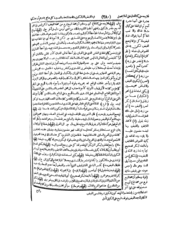 (وَلَوْ كَانَ لَهُ) أَيْ لِبَكْرٍ (طَعَامٌ) مَثَلًا (مُقَدَّرٌ عَلَى زَيْدٍ) كَعَشَرَةِ آصُعٍ (وَلِعَمْرٍو عَلَيْهِ مِثْلُهُ فَلْيَكْتَلْ لِنَفْسِهِ) مِنْ زَيْدٍ (ثُمَّ) يَكْتَلْ (لِعَمْرٍو) ، لِيَكُونَ الْقَبْضُ وَالْإِقْبَاضُ صَحِيحَيْنِ (وَيَكْفِي اسْتِدَامَةٌ فِي نَحْوِ الْمِكْيَالِ) هَذَا مِنْ زِيَادَتِي، (فَلَوْ قَالَ) بَكْرٌ: لِعَمْرٍو (اقْبِضْ مِنْهُ) أَيْ مِنْ زَيْدٍ (مَا لِي عَلَيْهِ لَك، فَفَعَلَ فَسَدَ الْقَبْضُ) بِقَيْدٍ زِدْته بِقَوْلِي (لَهُ) لِاتِّحَادِ الْقَابِضِ وَالْمُقْبِضِ، وَمَا قَبَضَهُ مَضْمُونٌ عَلَيْهِ وَلَا يَلْزَمُهُ رَدُّهُ لِدَافِعِهِ، بَلْ يَكِيلُهُ الْمَقْبُوضُ لَهُ لِلْقَابِضِ، وَأَمَّا قَبْضُهُ لِبَكْرٍ فَصَحِيحٌ تَبْرَأُ بِهِ ذِمَّةُ زَيْدٍ لِإِذْنِهِ فِي الْقَبْضِ مِنْهُ