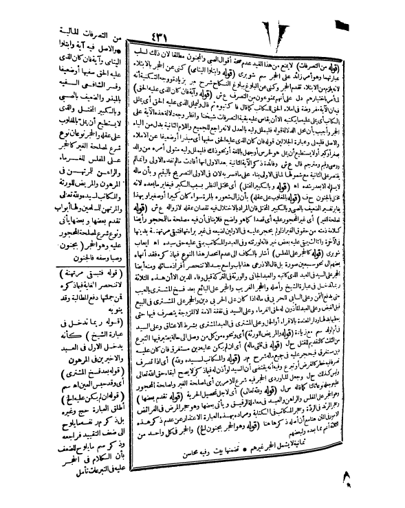 مِنْ التَّصَرُّفَاتِ الْمَالِيَّةِ وَالْأَصْلُ فِيهِ آيَةُ {وَابْتَلُوا الْيَتَامَى} [النساء: 6] وَآيَةُ {فَإِنْ كَانَ الَّذِي عَلَيْهِ الْحَقُّ سَفِيهًا أَوْ ضَعِيفًا} [البقرة: 282] وَفَسَّرَ الشَّافِعِيُّ السَّفِيهَ بِالْمُبَذِّرِ وَالضَّعِيفَ بِالصَّبِيِّ وَبِالْكَبِيرِ الْمُخْتَلِّ وَاَلَّذِي لَا يَسْتَطِيعُ أَنْ يُمِلَّ بِالْمَغْلُوبِ عَلَى عَقْلِهِ وَالْحَجْرُ نَوْعَانِ: نَوْعٌ شُرِعَ لِمَصْلَحَةِ الْغَيْرِ كَالْحَجْرِ عَلَى الْمُفْلِسِ لِلْغُرَمَاءِ وَالرَّاهِنِ لِلْمُرْتَهِنِ فِي الْمَرْهُونِ وَالْمَرِيضِ لِلْوَرَثَةِ فِي ثُلُثَيْ مَالِهِ وَالْعَبْدِ لِسَيِّدِهِ وَالْمُكَاتَبِ لِسَيِّدِهِ وَلِلَّهِ تَعَالَى، وَالْمُرْتَدِّ لِلْمُسْلِمِينَ وَلَهَا أَبْوَابٌ تَقَدَّمَ بَعْضُهَا وَبَعْضُهَا يَأْتِي، وَنَوْعٌ شُرِعَ لِمَصْلَحَةِ الْمَحْجُورِ عَلَيْهِ وَهُوَ الْحَجْرُ (بِجُنُونٍ وَصِبًا وَسَفَهٍ فَالْجُنُونُ