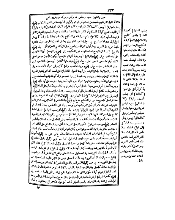 فَالثَّلَاثَةُ الْأُوَلُ حُجِرَ عَلَيْهِمْ لِحَقِّهِمْ وَمَنْ بَعْدَهُمْ لِحَقِّ غَيْرِهِمْ وَالرَّقِيقُ فِي الْبَيْتِ شَامِلٌ لِلْقِنِّ وَالْمُكَاتَبِ (قَوْلُهُ: يَسْلُبُ الْعِبَارَةَ) أَيْ سَوَاءٌ كَانَتْ لَهُ كَالْإِسْلَامِ أَوْ عَلَيْهِ كَالرِّدَّةِ فَقَوْلُهُ: وَالْإِسْلَامِ أَيْ فِعْلًا وَتَرْكًا وَقَوْلُهُ: وَالْوِلَايَةُ أَيْ الثَّابِتَةُ بِالشَّرْعِ كَوِلَايَةِ النِّكَاحِ أَوْ بِالتَّفْوِيضِ كَالْإِيصَاءِ وَالْقَضَاءِ وَعَبَّرَ بِالسَّلْبِ دُونَ الْمَنْعِ؛ لِأَنَّ الثَّانِيَ لَا يُفِيدُ السَّلْبَ بِدَلِيلِ أَنَّ الْإِحْرَامَ مَانِعٌ مِنْ الْوِلَايَةِ فِي النِّكَاحِ وَلَا يَسْلُبُهَا وَلِهَذَا يُزَوِّجُ الْحَاكِمُ فِي حَالَ إحْرَامِ الْوَلِيِّ دُونَ الْأَبْعَدِ شَرْحُ م ر مَعَ زِيَادَةٍ مِنْ الشَّوْبَرِيِّ وَمِثْلُ الْجُنُونِ الْخَرَسُ حَيْثُ لَا إشَارَةَ مُفْهِمَةً فَوَلِيُّهُ وَلِيُّ الْمَجْنُونِ وَلَوْ طَرَأَ وَإِنْ كَانَ الْمَجْنُونُ لَهُ نَوْعُ تَمْيِيزٍ كَانَ كَالصَّبِيِّ الْمُمَيِّزِ فِيمَا يَأْتِي ح ل (قَوْلُهُ: وَالدِّينُ) بِكَسْرِ الدَّالِ فَلَا يَصِحُّ إسْلَامُهُ لِتَوَقُّفِهِ عَلَى التَّكْلِيفِ زي (قَوْلُهُ: وَالْإِيصَاءِ) أَيْ لَا تَنْفُذُ وَصِيَّتُهُ عَلَى أَوْلَادِهِ لِغَيْرِهِ ع ش (قَوْلُهُ: وَالْأَيْتَامِ) أَيْ وَوِلَايَةِ الْأَيْتَامِ فَلَا يَصِحُّ أَنْ يَكُونَ الْمَجْنُونُ مُوصًى لَهُ عَلَى الْأَيْتَامِ أَوْ فِيمَا عَلَيْهِ حَتَّى إذَا جُنَّ انْعَزَلَ ح ل (قَوْلُهُ: فَيُعْتَبَرُ مِنْهَا التَّمَلُّكُ) أَيْ حُصُولُ الْمِلْكِ مِنْ غَيْرِ اعْتِبَارِ لَفْظٍ يَدُلُّ عَلَيْهِ ع ش (قَوْلُهُ: وَيَثْبُتُ النَّسَبُ بِزِنَاهُ) كَأَنْ وَطِئَ امْرَأَةً فَأَتَتْ مِنْهُ بِوَلَدٍ فَإِنَّهُ يُنْسَبُ إلَيْهِ وَلَا يُقَالُ وَلَدُ الزِّنَا لَا يُنْسَبُ إلَى أَبِيهِ؛ لِأَنَّا نَقُولُ إطْلَاقُ الزِّنَا عَلَى فِعْلِهِ إنَّمَا هُوَ بِاعْتِبَارِ الصُّورَةِ لَا الْحَقِيقَةِ كَمَا يُعْلَمُ مِنْ بَابِهِ شَوْبَرِيٌّ فَهُوَ وَطْءُ شُبْهَةٍ؛ لِأَنَّ زَوَالَ عَقْلِهِ صَيَّرَ زِنَاهُ كَوَطْئِهِ بِشُبْهَةٍ لِعَدَمِ قَصْدِهِ ع ش فَيَلْزَمُهُ الْمَهْرُ إنْ لَمْ تَكُنْ مُطَاوِعَةً وَإِذَا وَطِئَ امْرَأَةً حَرُمَ عَلَيْهِ أُمُّهَا وَبِنْتُهَا وَحُرِّمَتْ عَلَى أَبِيهِ وَابْنِهِ (قَوْلُهُ: وَيَغْرَمُ مَا أَتْلَفَهُ) نَعَمْ لَا يَضْمَنُ صَيْدًا أَتْلَفَهُ فِي الْحَرَمِ كَمَا فِي شَرْحِ م ر لِبِنَاءِ حَقِّ اللَّهِ تَعَالَى عَلَى الْمُسَامَحَةِ.
