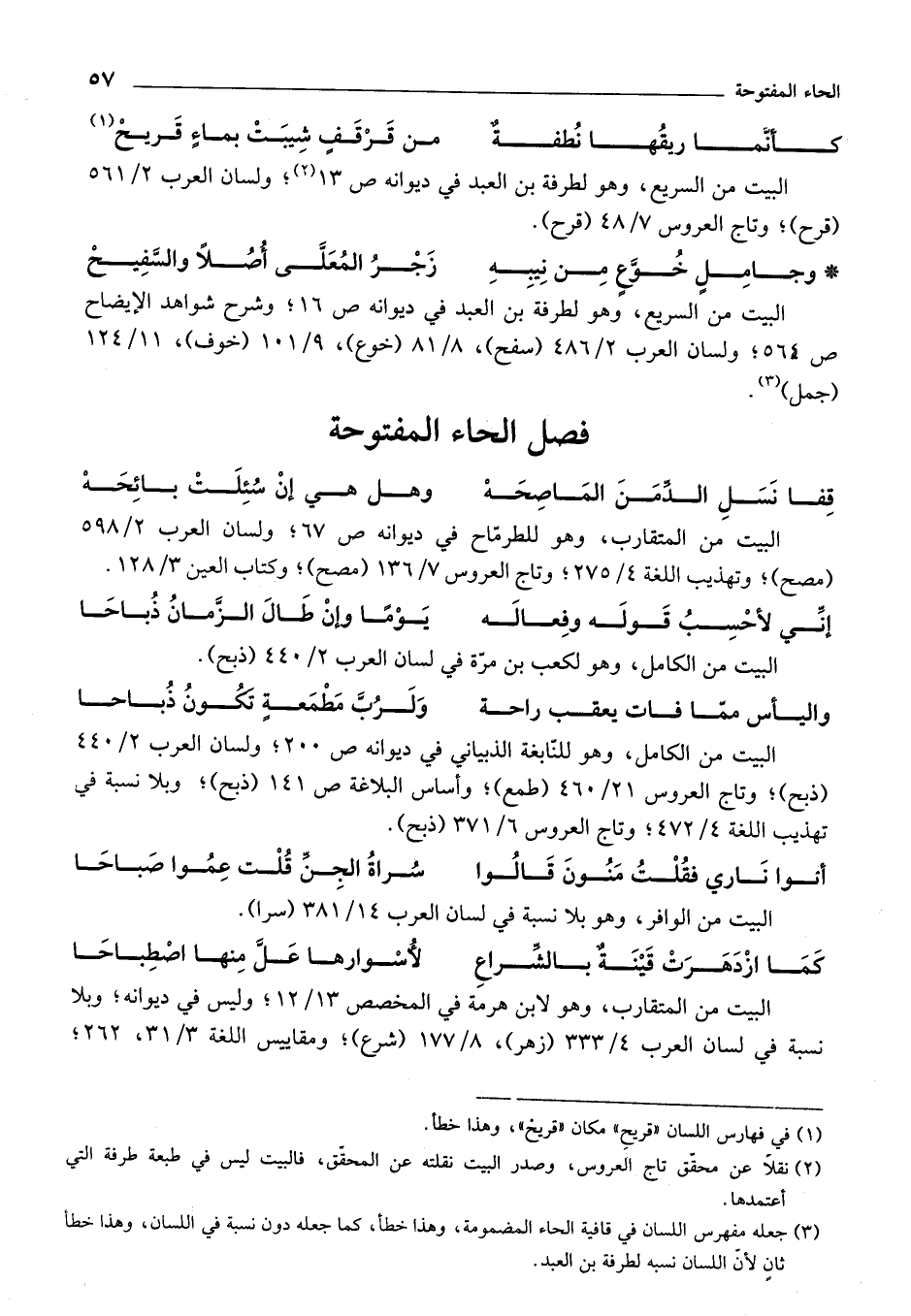 (¬3) جعله مفهرس اللسان في قافية الحاء المضمومة، وهذا خطأ، كما جعله دون نسبة في اللسان، وهذا خطأ ثانٍ لأن اللسان نسبة لطرفة بن العبد.