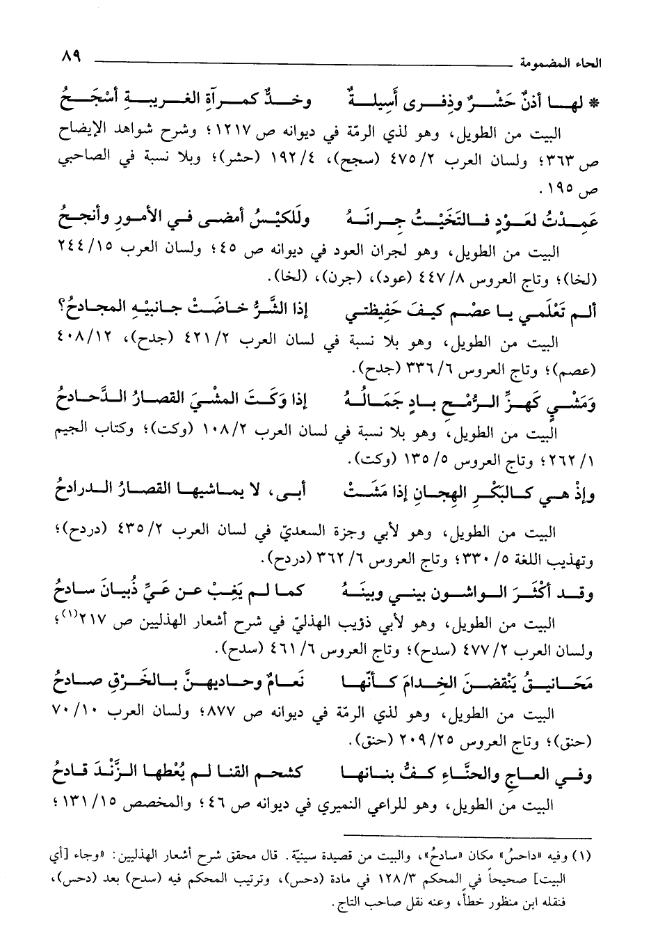 (¬1) وفيه "داحسُ" مكان "سادحُ"، والبيت من قصيدة سينية. قال محقق شرح أشعار الهذليين: "وجاء [أي البيت] صحيحاً في المحكم 3/ 128 في مادة (دحس)، وترتيب المحكم فيه (سدح) بعد (دحس)، فنقله ابن منظور خطأ، وعنه نقل صاحب التاج.