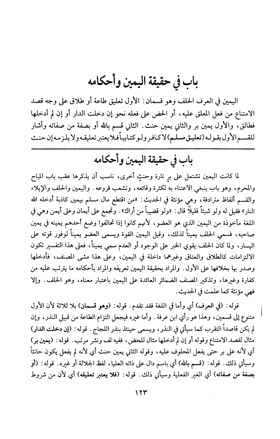 لما كانت اليمين تشتمل على بر تارة وحنث أخرى ناسب أن يذكرها عقب باب المباح والمحرم وهو باب ينبغي الاعتناء به لكثرة وقائعه وتشعب فروعه . واليمين والحلف والإيلاء والقسم : ألفاظ مترادفة وهي مؤنثة في الحديث : من اقتطع مال مسلم بيمين كاذبة أدخله الله النار فقيل له ولو شيئا قليلا ؟ قال ولو قضيبا من أراك . وتجمع على أيمان وعلى أيمن وهي في اللغة مأخوذة من اليمين الذي هو العضو لأنهم كانوا إذا تحالفوا وضع أحدهم يمينه في يمين صاحبه فسمى الحلف يمينا لذلك وقيل اليمين : القوة ويسمى العضو يمينا لوفور قوته على اليسار ؛ ولما كان الحلف يقوي الخبر على الوجود أو العدم سمي يمينا فعلى هذا التفسير تكون الالتزامات كالطلاق والعتاق وغيرهما داخلة في اليمين وعلى هذا مشى المصنف فأدخلها وصدر بها بخلافها على الأول والمراد بحقيقة اليمين تعريفه . والمراد بأحكامه : ما يترتب عليه من كفارة وغيرها وتذكير المصنف الضمائر العائدة على اليمين باعتبار معناه وهو الحلف وإلا فهي مؤنثة كما علمت في الحديث .