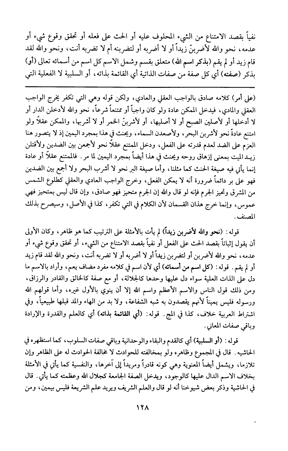 قوله : 16 ( أو السلبية ) : أي كالقدم والبقاء والوحدانية وباقي صفات السلوب كما استظهره في الحاشية قال في المجموع : وظاهره ولو بمخالفته للحوادث لا مخالفة الحوادث له على الظاهر وإن تلازما ويشمل أيضا المعنوية وهي كونه قادرا ومريدا إلى آخرها والنفسية كما يأتي في الأمثلة بخلاف الاسم الدال عليها كالوجود ويدخل الصفة الجامعة كجلال الله وعظمته كما يأتي قال في الحاشية : وذكر بعض شيوخنا أنه لو قال : والعلم الشريف ويريد علم الشريعة فليس بيمين ومن