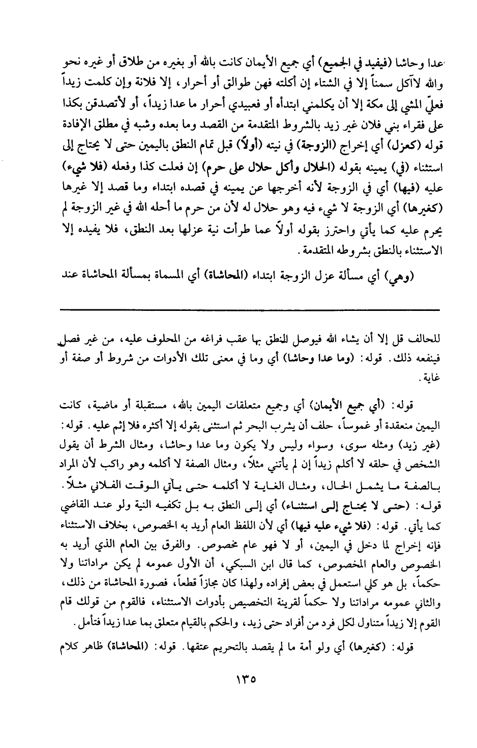 قوله : 16 ( فلا شيء عليه فيها ) : أي لأن اللفظ العام أريد به الخصوص بخلاف الاستثناء فإنه إخراج لما دخل في اليمين أولا فهو عام مخصوص . والفرق بين العام الذي أريد به الخصوص والعام المخصوص كما قال ابن السبكي أن الأول عمومه لم يكن مرادا تناولا ولا حكما بل هو كلي استعمل في بعض أفراده ولهذا كان مجازا قطعا فصورة المحاشاة من ذلك والثاني عمومه مراد تناولا حكما لقرينة التخصيص بأدوات الاستثناء فالقوم من قولك : قام القوم إلا زيدا متناول لكل فرد من أفراده حتى زيد والحكم بالقيام متعلق بما عدا زيدا فتأمل .