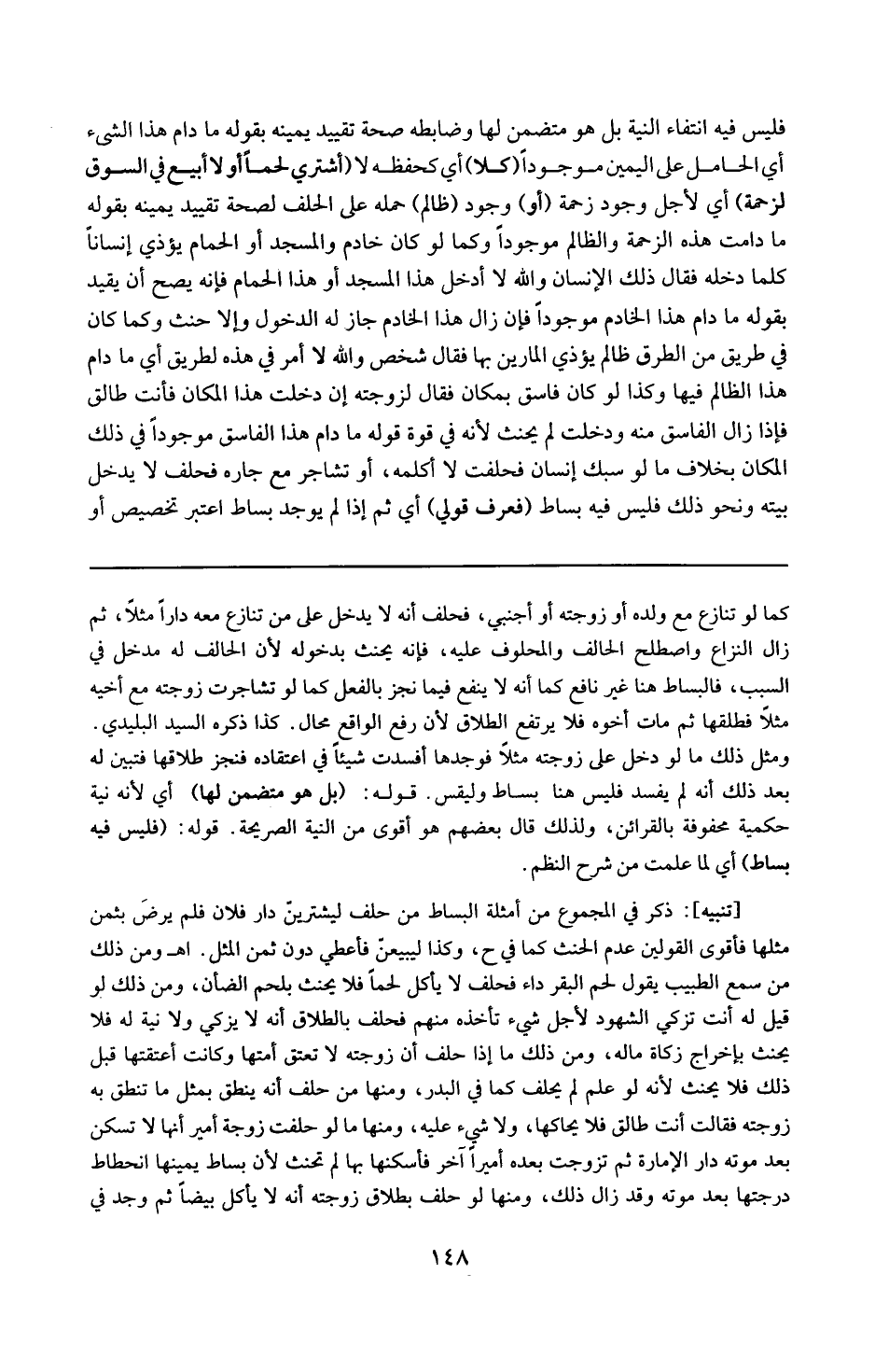 تنبيه : ذكر في المجموع من أمثلة البساط : من حلف ليشترين دار فلان فلم يرض بثمن مثلها فأقوى القولين عدم الحنث كما في ( ح ) وكذا ليبيعن فأعطى دون ثمن المثل ( اه ) ومن ذلك من سمع الطبيب يقول لحم البقر داء فحلف لا يأكل لحما فلا يحنث بلحم الضأن ومن ذلك لو قيل له : أنت تزكي الشهود لأجل شيء تأخذه منهم فحلف بالطلاق إنه لا يزكي ولا نية له فلا يحنث بإخراج زكاة ماله . ومن ذلك ما إذا حلف أن زوجته لا تعتق أمتها وكانت أعتقتها قبل ذلك فلا يحنث لأنه لو علم لم يحلف كما في البدر ومنها من حلف أنه ينطق بمثل ما تنطق به زوجته فقالت أنت طالق فلا يحاكيها ولا شيء عليه ومنها ما لو حلفت زوجة أمير أنها لا تسكن بعد موته دار الإمارة . ثم تزوجت بعده أميرا آخر فأسكنها بها لم تحنث لأن بساط يمينها انحطاط درجتها بعد موته وقد زال ذلك ومنها لو حلف بطلاق زوجته أنه لا يأكل بيضا ثم وجد في